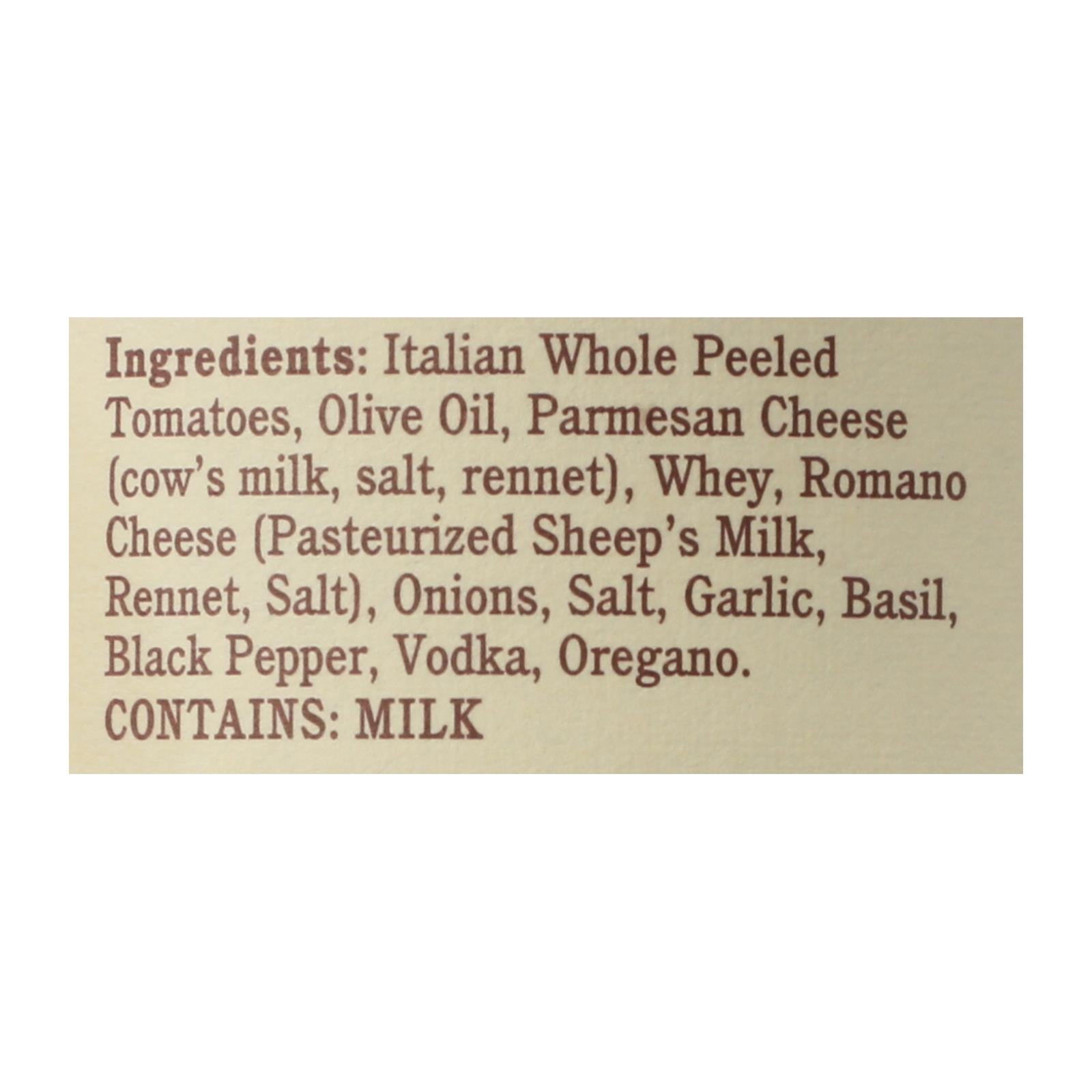 ingredients : italian whole peeled tomatoes;olive oil;parmesan cheese (cow's milk, salt, rennet);whey;romano cheese (pasteurized sheep's milk, rennet, salt);onions;salt;garlic;basil;black pepper;vodka;oregano