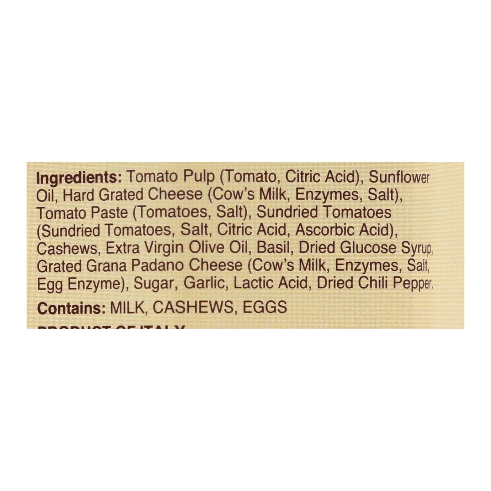 ingredients : tomato pulp (tomato, citric acid);sunflower oil;hard grated cheese (cow s milk, enzymes, salt);tomato paste (tomatoes, salt);sundried tomatoes (sundried tomatoes, salt, citric acid, ascorbic acid);cashews;extra virgin olive oil;basil;dried glucose syrup;grated grana padano cheese (cow s milk, enzymes, salt, egg enzyme);sugar;garlic;lactic acid;dried chili pepper