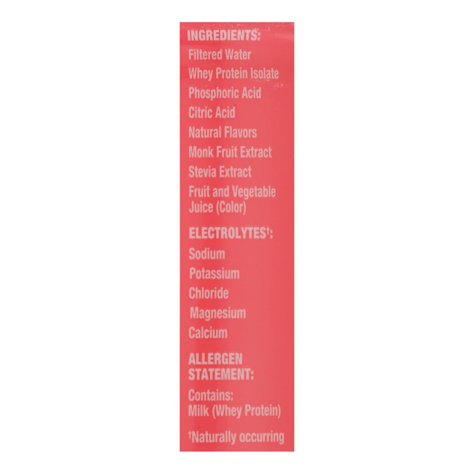 ingredients : electrolytes : sodium potassium chloride magnesium calcium;filtered water whey protein isolate phosphoric acid citric acid natural flavors monk fruit extract stevia extract fruit and vegetable juice (color)