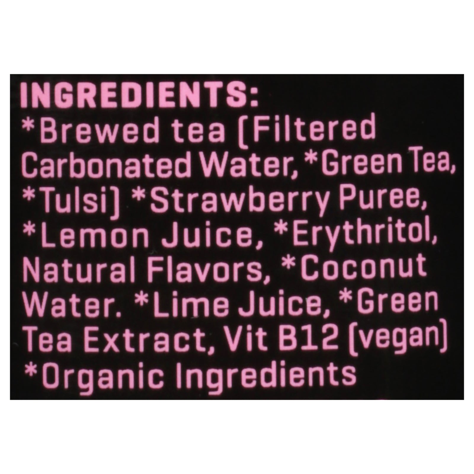 ingredients : brewed tea (filtered carbonated water, *green tea, *tulsi *coconut water);strawberry puree;prebiotic fiber;natural flavors;lemon juice;lime juice;green tea extract;vit;b12 (vegan)