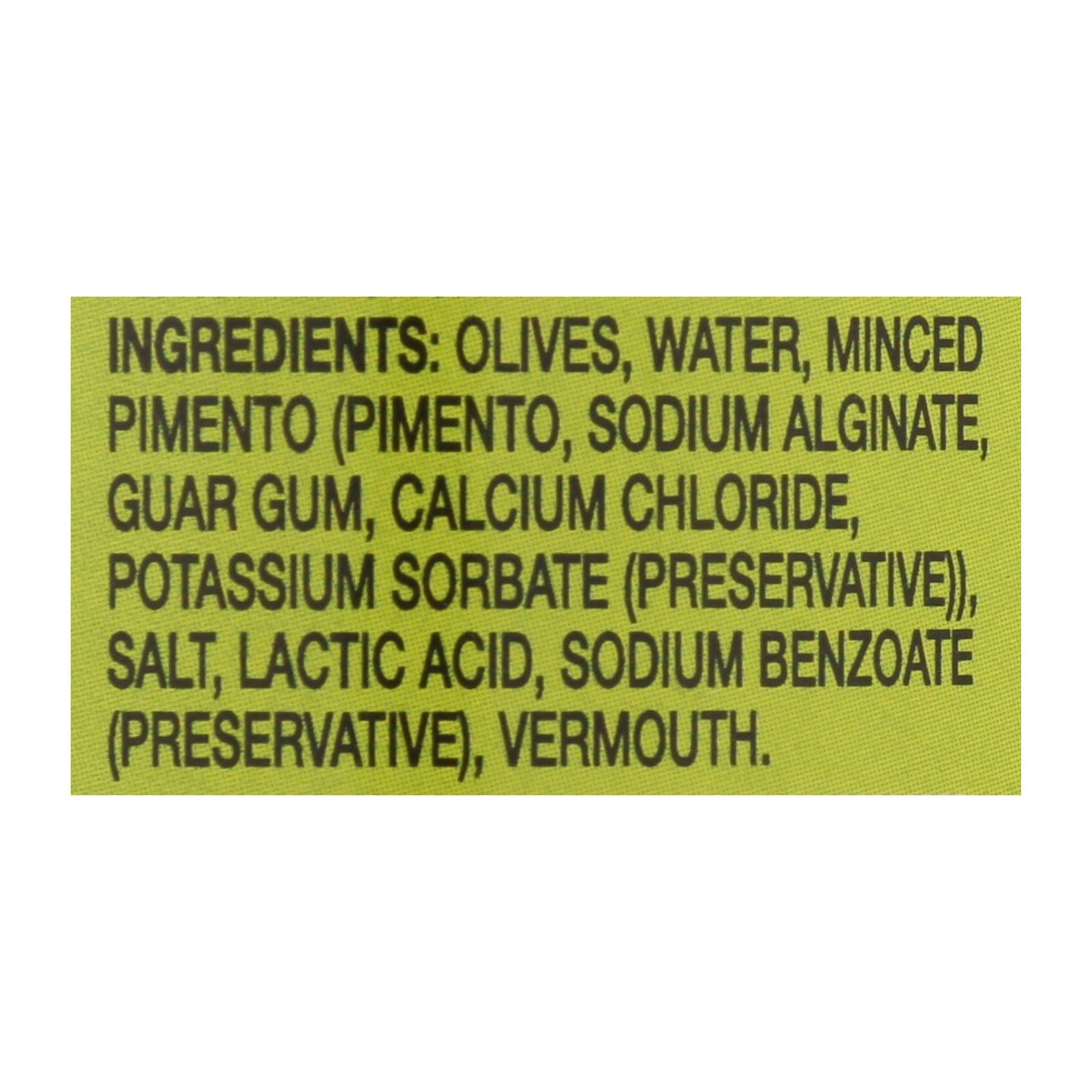 ingredients : olives;water;minced pimento (pimento, sodium alginate, guar gum, calcium chloride, potassium sorbate (preservative));salt;lactic acid;sodium benzoate (preservative);vermouth