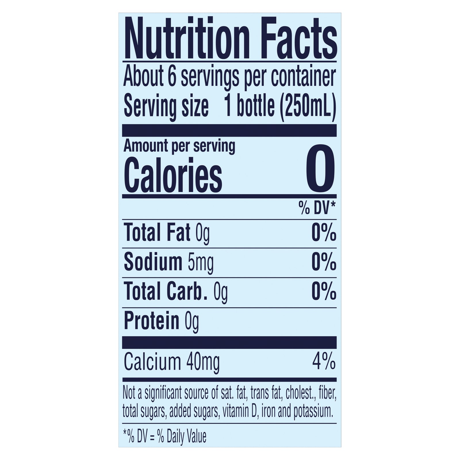 Very low sodium, 0 calories per bottle, for questions or a report on water quality and information contact 800-255-8334 or sanpellegrino.com. Natural mineral water with natural co2 added total dissolved solids 915 mg/l, san pellegrino terme 1899