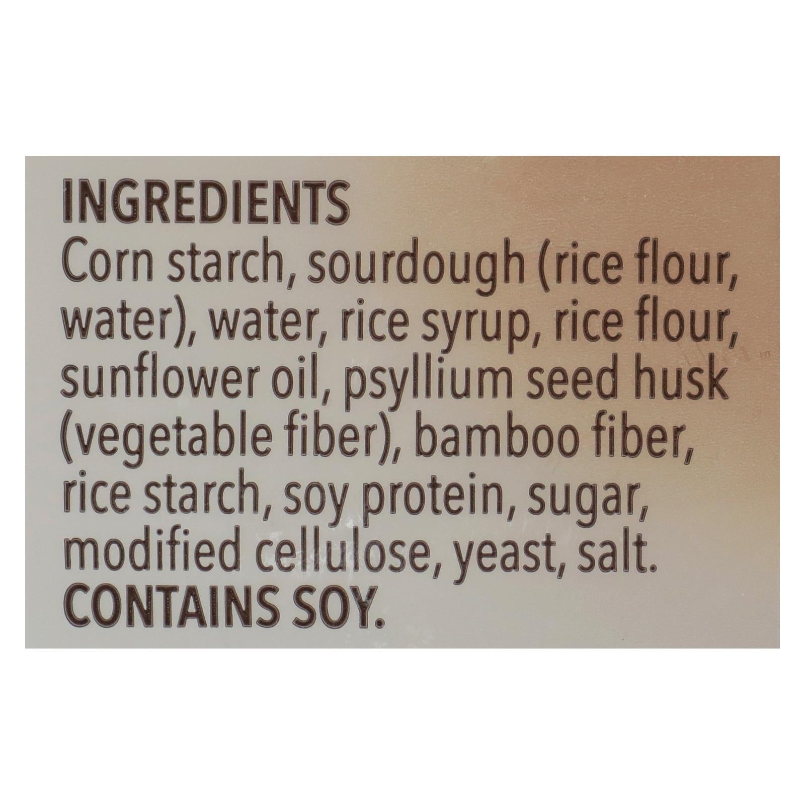 ingredients : corn starch;water;sourdough (rice flour, water);rice flour;psyllium seed husk (vegetable fiber);high oleic sunflower oil;soy protein;modified cellulose;rice starch;corn germ;yeast;rice syrup;bamboo fiber;iodized salt (salt, potassium iodide)