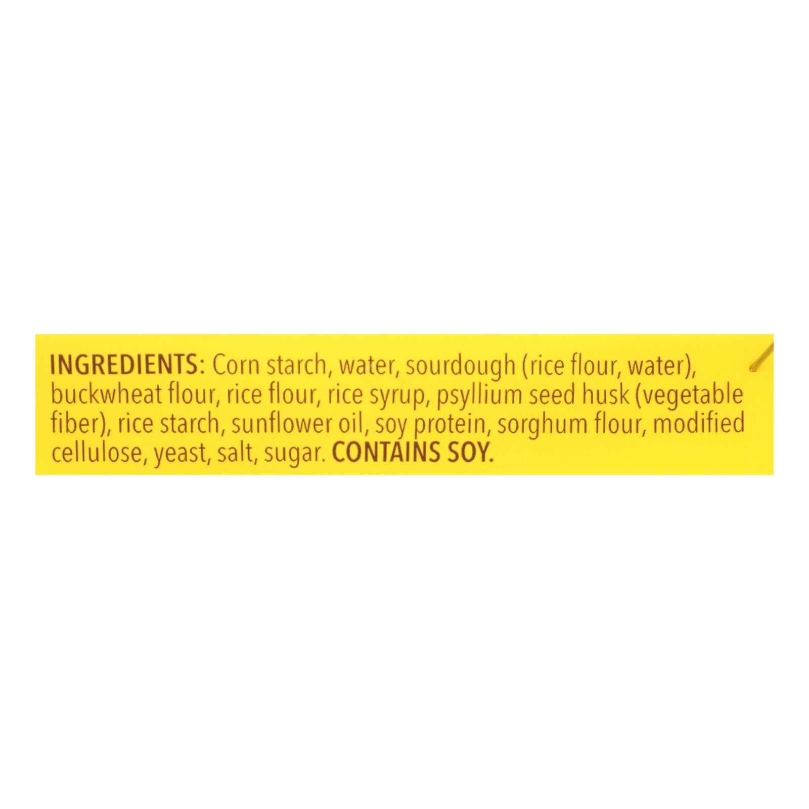 ingredients : corn starch;water;sourdough (rice flour, water);buckwheat flour;rice flour;rice syrup;psyllium seed husk (vegetable fiber);rice starch;sunflower oil;soy protein;sorghum flour;modified cellulose;yeast;salt;sugar