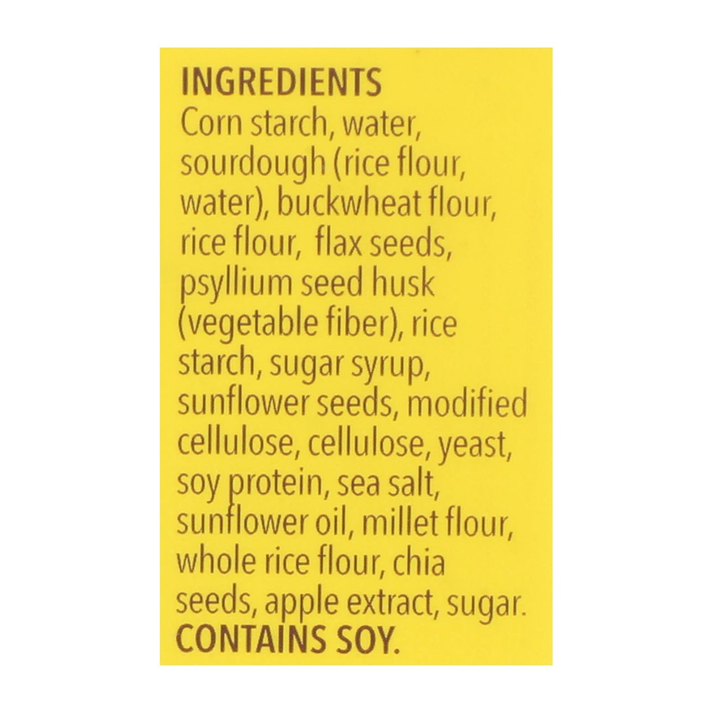 ingredients : corn starch;water;sourdough (rice flour, water);buckwheat flour;rice flour;flax seeds;psyllium seed husk (vegetable fiber);rice starch;sugar syrup;sunflower seeds;modified cellulose;cellulose;yeast;soy protein;sea salt;sunflower oil;millet flour;whole rice flour;chia seeds;apple extract;sugar