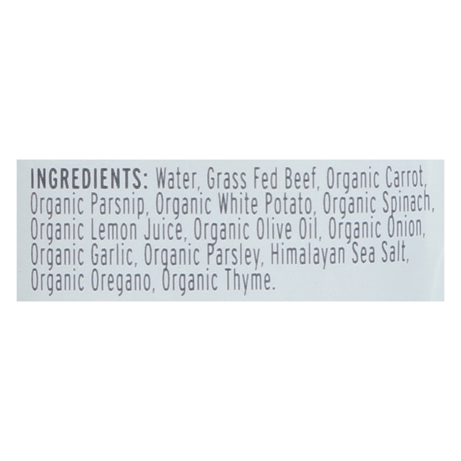 ingredients : water;grass fed beef;organic carrot;organic parsnip;organic white potato;organic spinach;organic lemon juice;organic olive oil;organic onion;organic garlic;organic parsley;himalayan sea salt;organic oregano;organic thyme