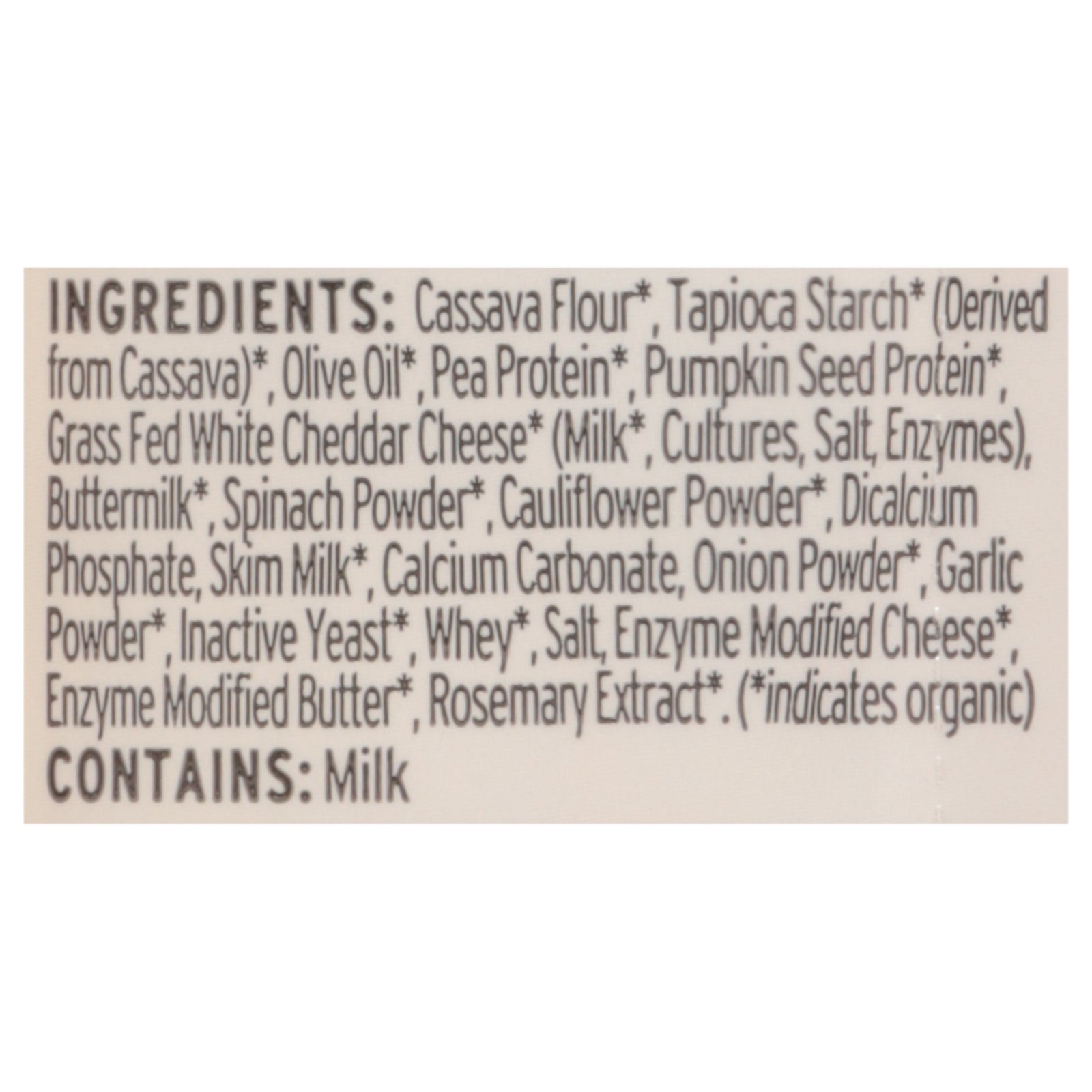 ingredients : cassava flour;tapioca starch* (derived from cassava);pea protein;olive oil;pumpkin seed protein;grass fed white cheddar cheese* (milk*, cultures, salt, enzymes);buttermilk;spinach powder;cauliflower powder;skim milk;dicalcium phosphate;calcium carbonate;onion powder;garlic powder;inactive yeast;whey;rosemary extract;salt;enzyme modified cheese;enzyme modified butter