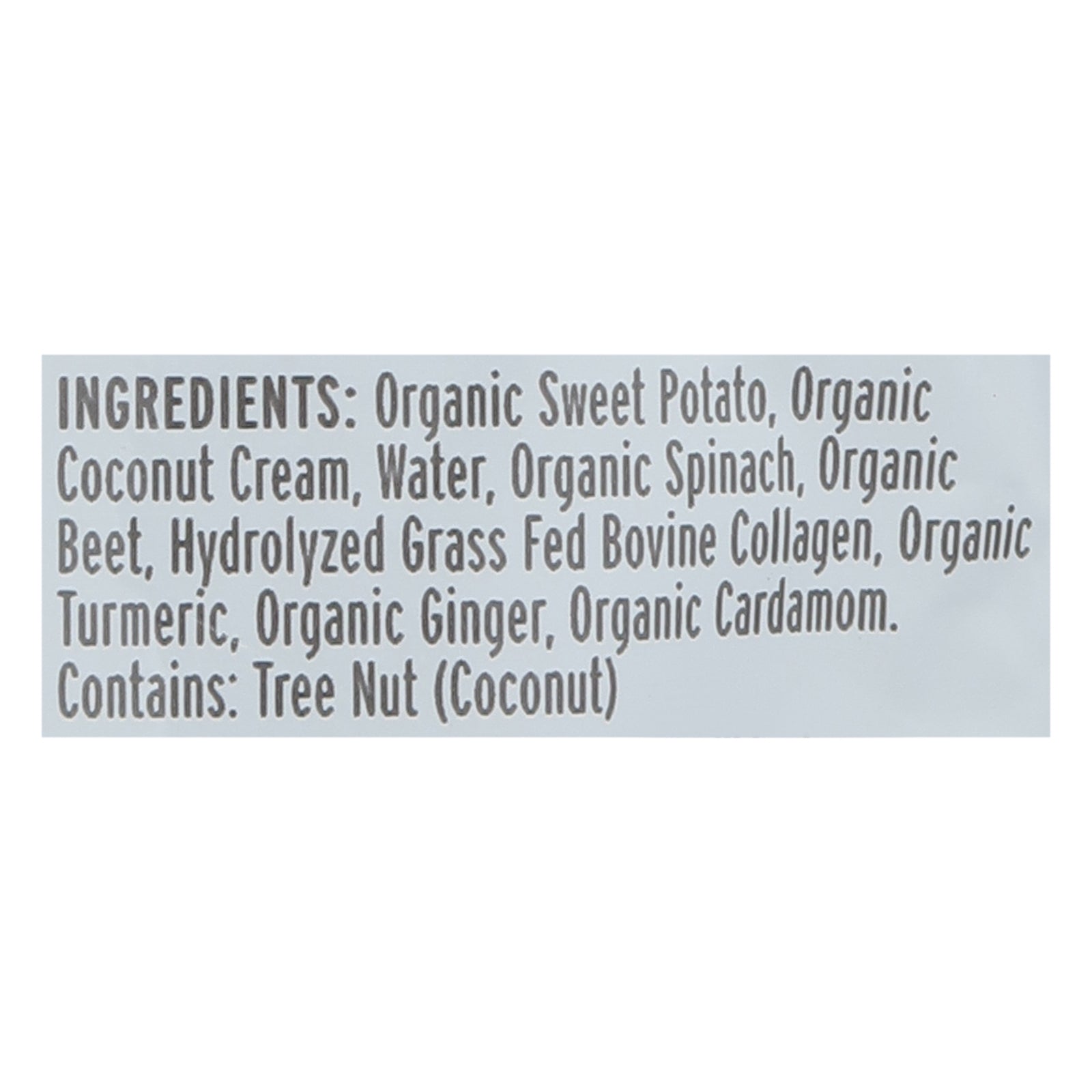 ingredients : organic sweet potato;organic coconut cream;water;organic spinach;organic beet;hydrolyzed grass fed bovine collagen;organic turmeric;organic ginger;organic cardamom