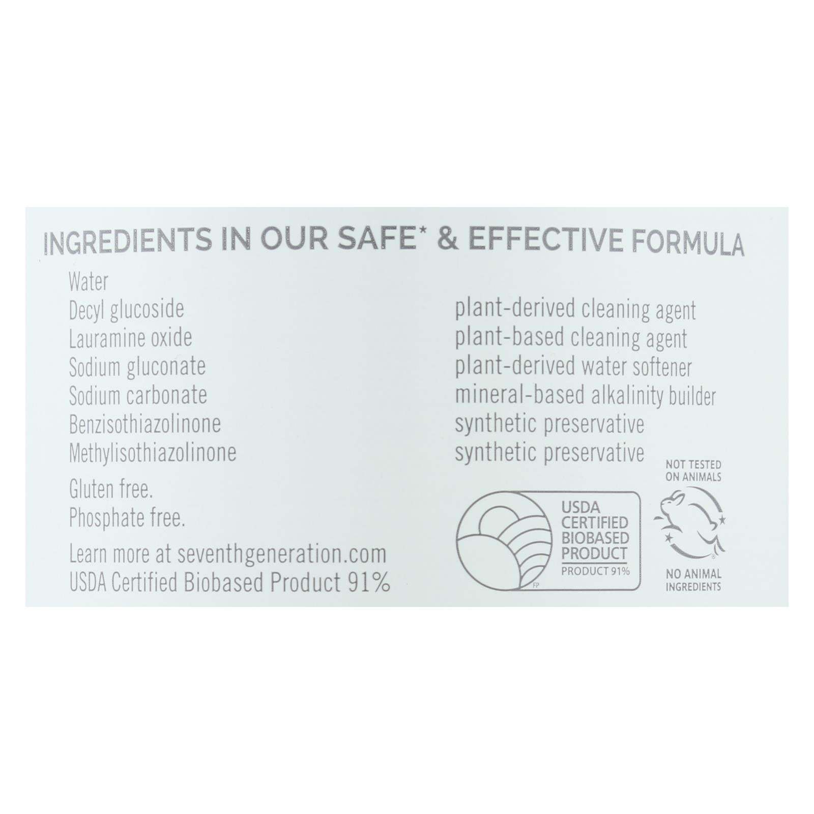 ingredients : water decyl glucoside plant-derived cleaning agent lauramine oxide plant-based cleaning agent sodium gluconate plant-derived water softener sodium carbonate mineral-based alkalinity builder benzisothiazolinone synthetic preservative methylisothiazolinone synthetic preservative