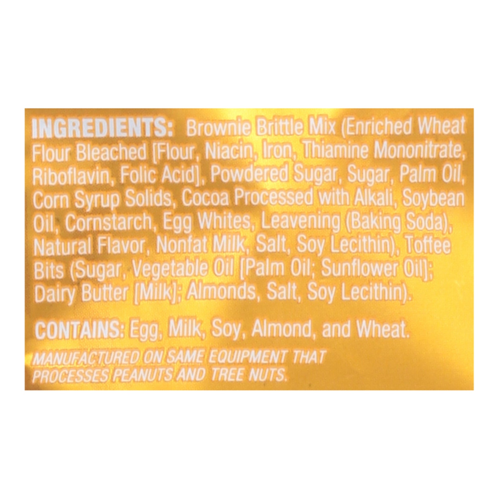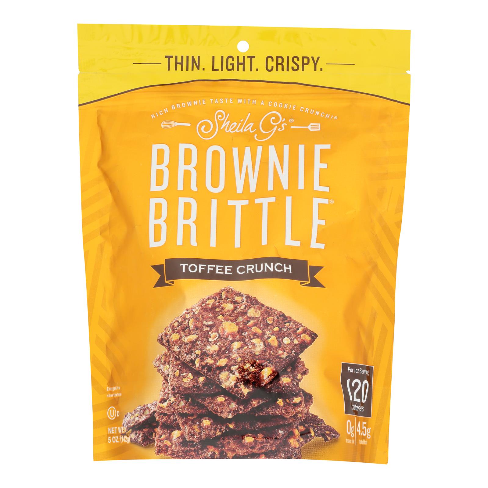 Sheila g's brownie brittle toffee crunch features a brownie and toffee taste with a hard cookie crunch. Every 5 oz. Bag of brittle contains 0 g. Of trans fat and cholesterol and contains five 120-calorie servings. Sheila g's brownie brittle toffee crunch is kosher-dairy. See nutrition facts panel for allergens.