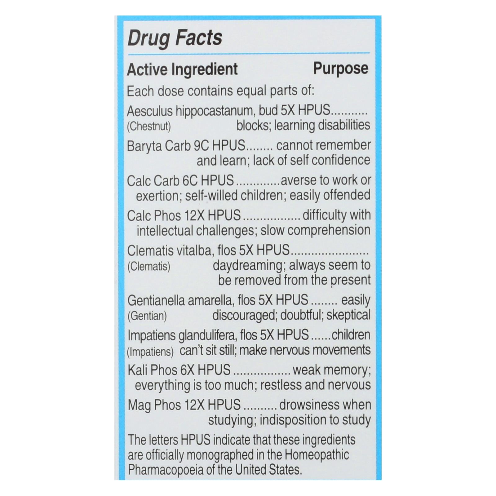 ingredients : drug facts active ingredient each dose contains equal parts of: aesculus hippocastanum;bud 5x hpus;chestnut;purpose: blocks; learning disabilities baryta carb 9c hpus purpose: cannot remember and learn; lack of self confidence calc carb 6c hpus purpose: averse to work or exertion; self-willed children; easily offended calc phos 12x hpus purpose: difficulty with intellectual challenges; slow comprehension clematis vitalba;flos 5x hpus;clematis;purpose: daydreaming; always seem to be removed fr