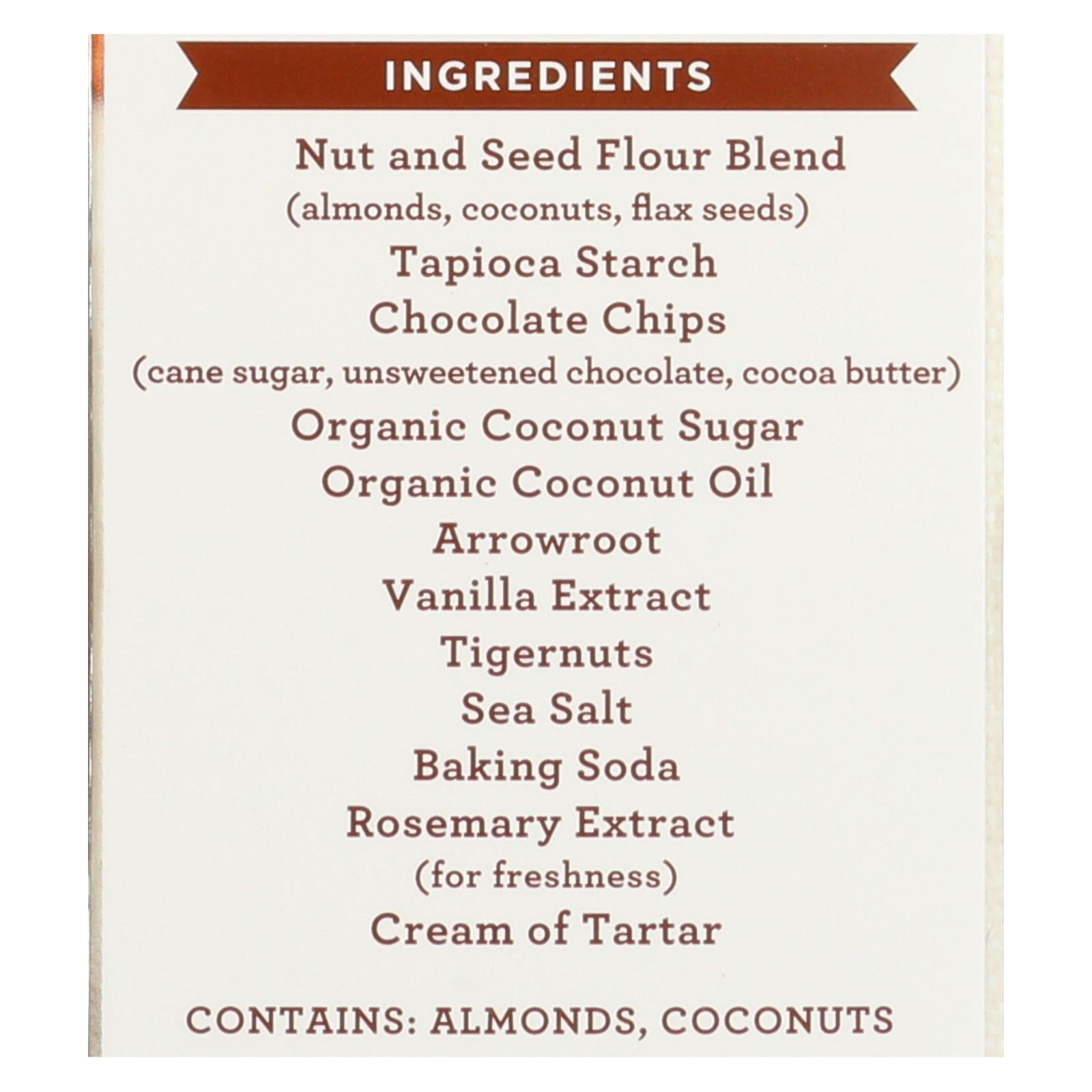 ingredients : nut and seed flour blend;almonds;coconuts;flax seeds;tapioca starch chocolate chips;cane sugar;unsweetened chocolate;cocoa butter;organic coconut sugar organic coconut oil arrowroot vanilla extract tigernuts sea salt baking soda rosemary extract;for freshness;cream of tartar