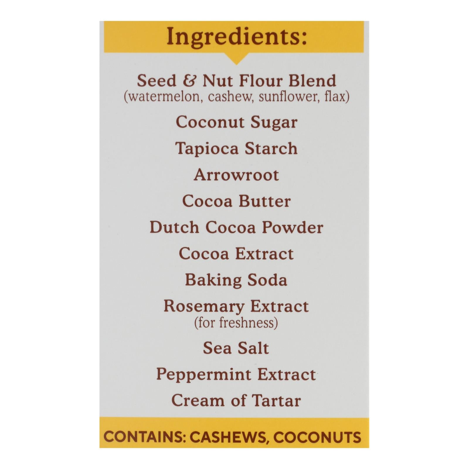 ingredients : seed & nut flour blend (watermelon, cashew, sunflower, flax) coconut sugar tapioca starch arrowroot cocoa butter dutch cocoa powder cocoa extract baking soda rosemary extract (for freshness) sea salt peppermint extract cream of tartar