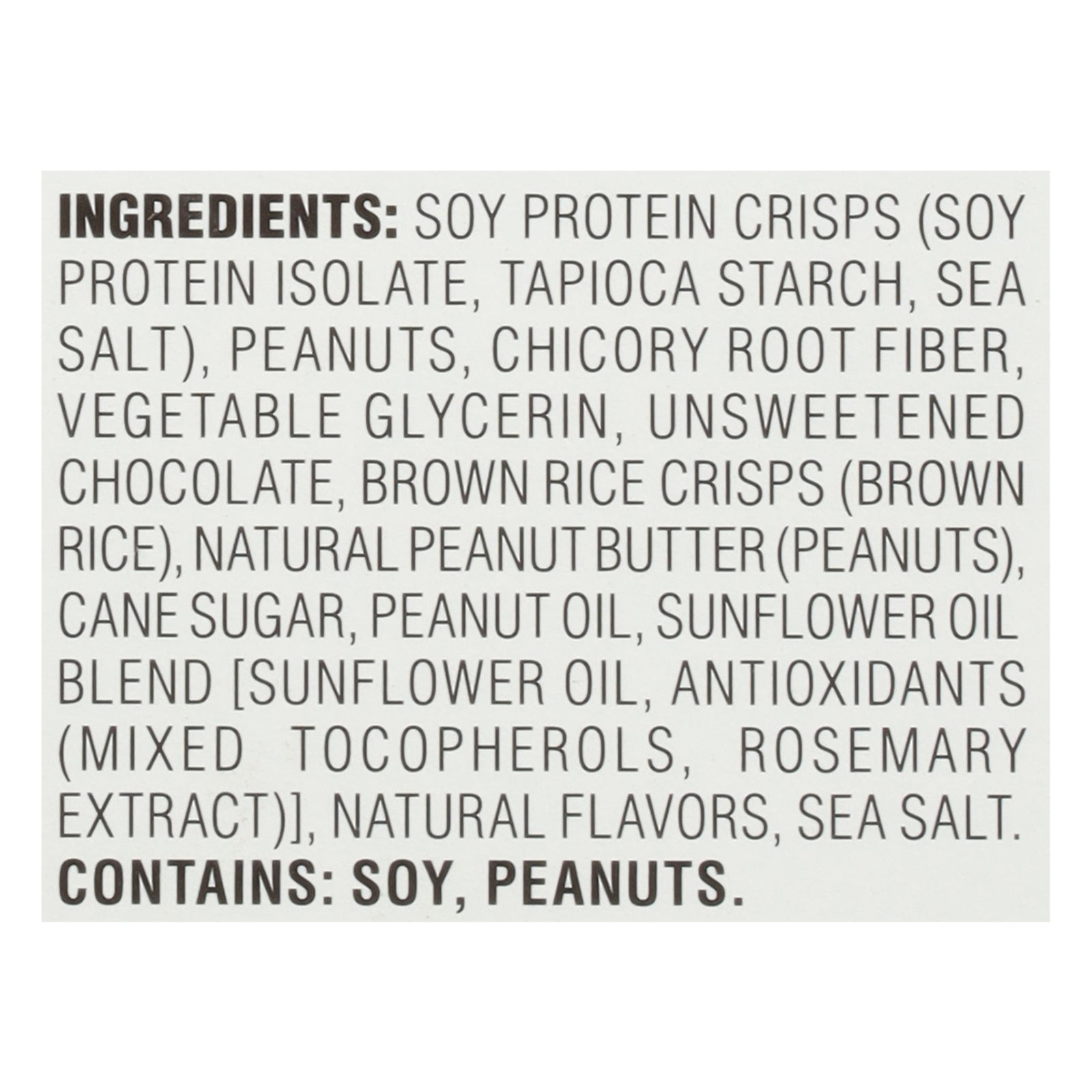 ingredients : soy protein crisps (soy protein isolate, tapioca starch, sea salt);peanuts;chicory root fiber;vegetable glycerin;unsweetened chocolate;brown rice crisps (brown rice);natural peanut butter (peanuts);cane sugar;peanut oil;sunflower oil blend [sunflower oil, antioxidants (mixed tocopherols, rosemary extract)];natural flavors;sea salt