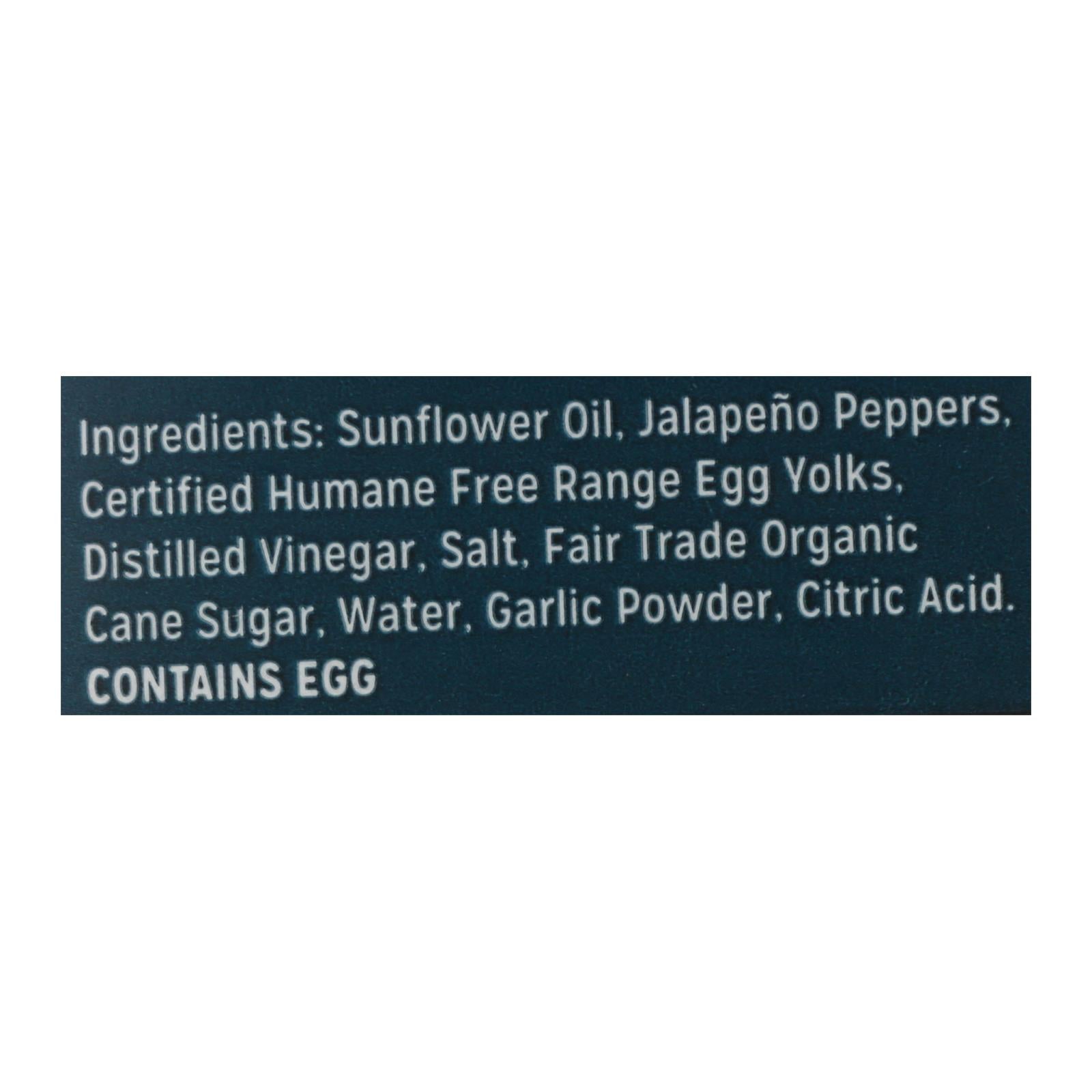 ingredients : sunflower oil;jalapeno peppers;certified humane free range egg yolks;distilled vinegar;salt;fair trade organic cane sugar;water;garlic powder;citric acid