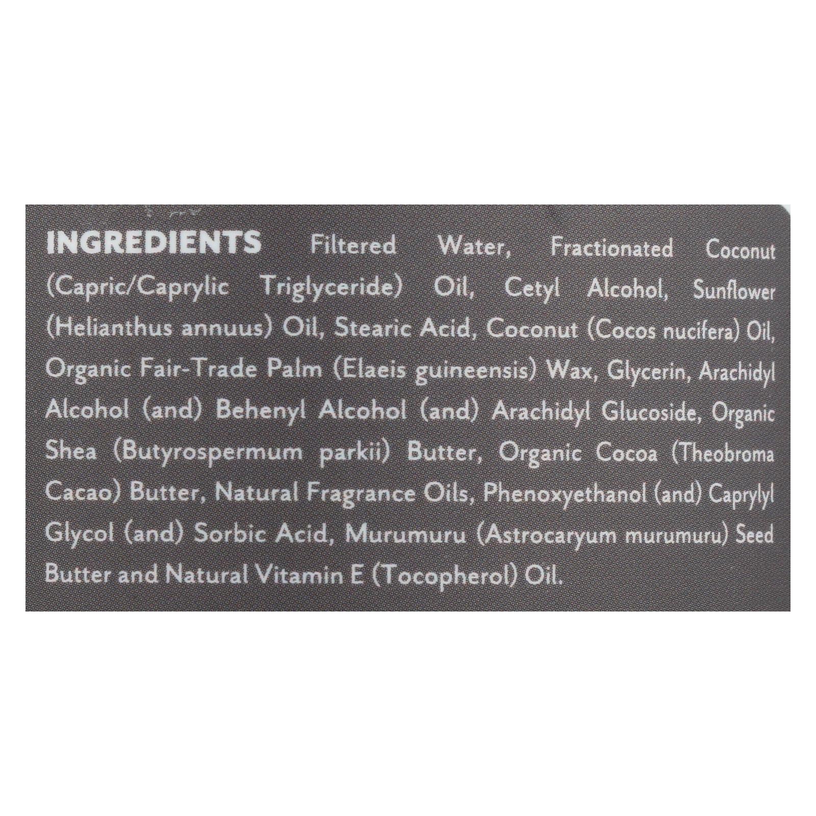 ingredients : filtered water;fractionated coconut;capric/caprylic triglyceride;oil;cetyl alcohol;sunflower;helianthus annuus;stearic acid;coconut;cocos nucifera;organic fair-trade palm;elaeis guineensis;wax;glycerin;arachidyl alcohol;and;behenyl alcohol;arachidyl glucoside;organic shea;butyrospermum parkii;butter;organic cocoa;theobroma cacao;natural fragrance oils;phenoxyethanol;caprylyl glycol;sorbic acid;murumuru;astrocaryum murumuru;seed butter and natural vitamin e;tocopherol