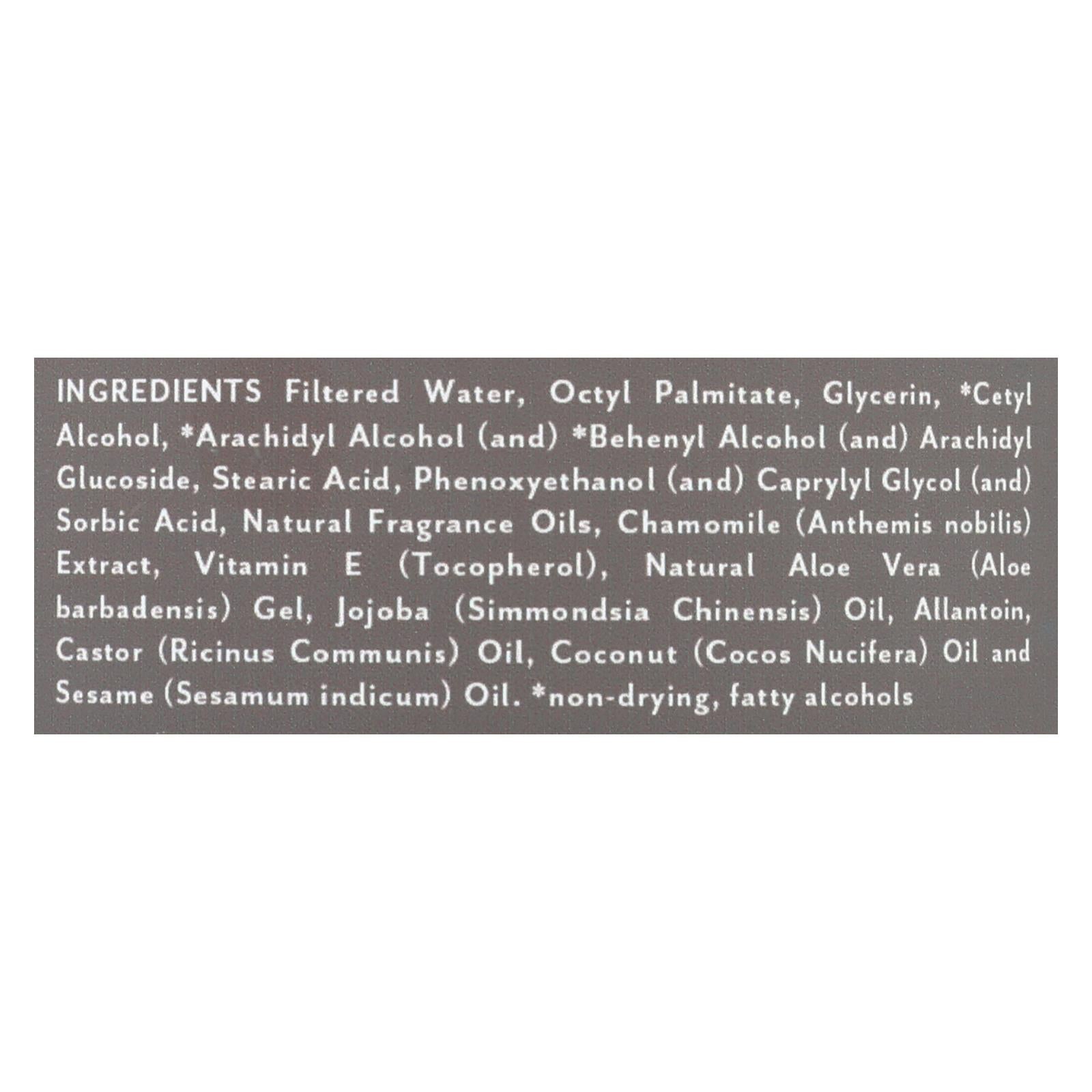 ingredients : filtered water;octyl palmitate;glycerin;cetyl alcohol;arachidyl alcohol;and;behenyl alcohol;arachidyl glucoside;stearic acid;phenoxyethanol;caprylyl glycol;sorbic acid;natural fragrance oils;chamomile;anthemis nobilis;extract;vitamin e;tocopherol;natural aloe vera;aloe barbadensis;gel;jojoba;simmondsia chinensis;oil;allantoin;castor;ricinus communis;coconut;cocos nucifera;oil and sesame;sesamum indicum