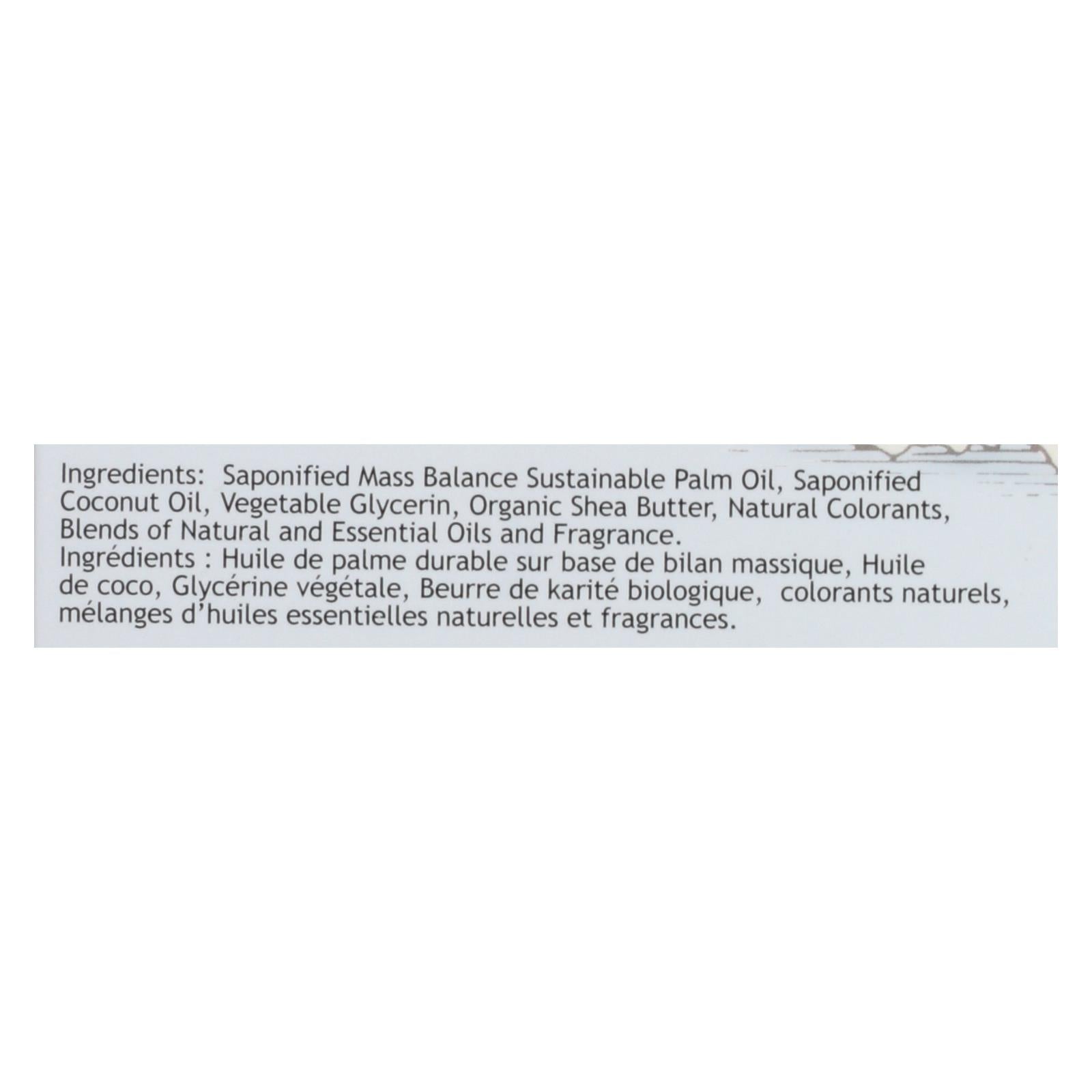 ingredients : saponified mass balance sustainable palm oil;saponified coconut oil;vegetable glycerin;organic shea butter;natural colorants;blends of natural and essential oils and fragrance