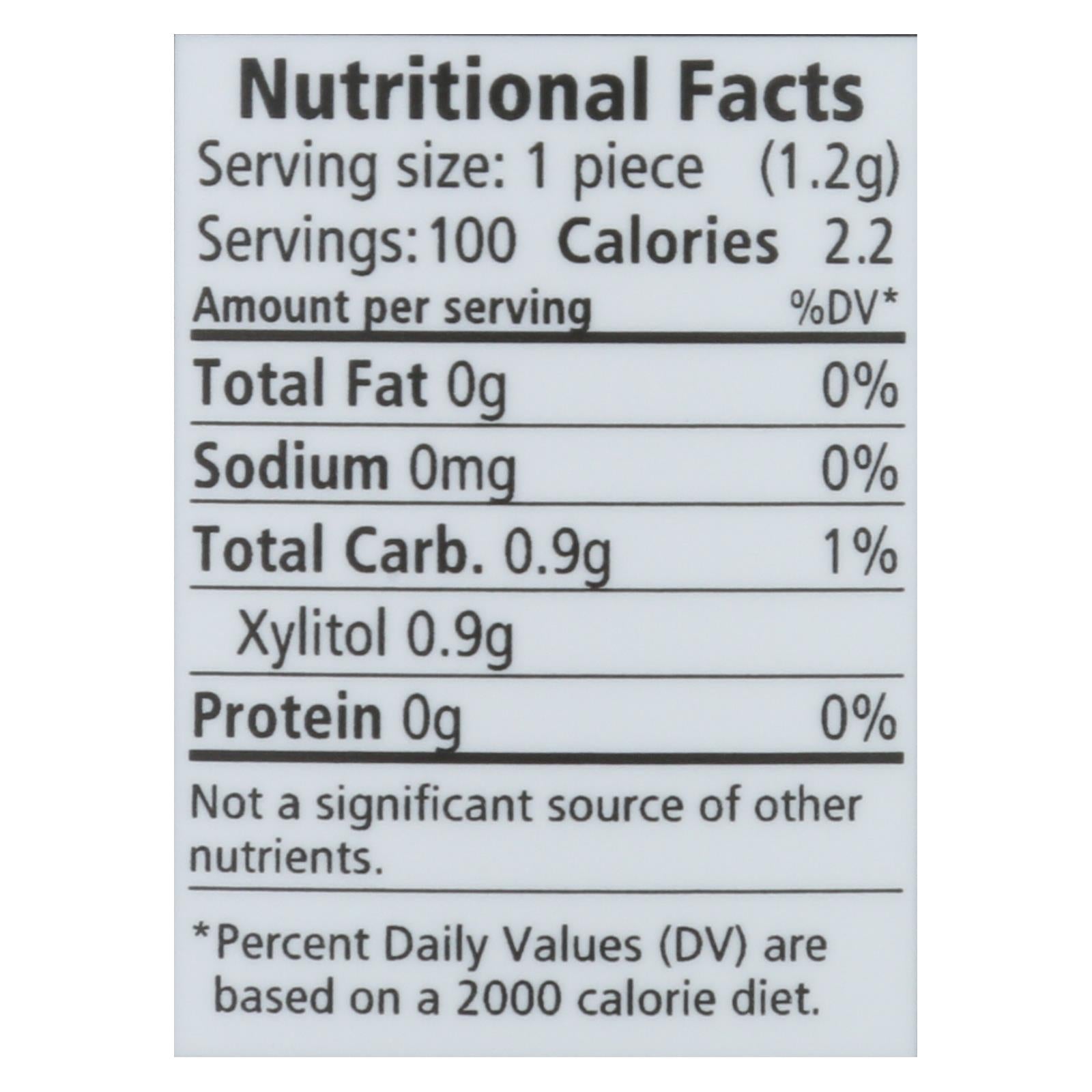 ingredients : xylitol;gum base;natural flavors;calcium carbonate;gum arabic;vegetable glycerin;sunflower lecithin;carnauba wax;stevia