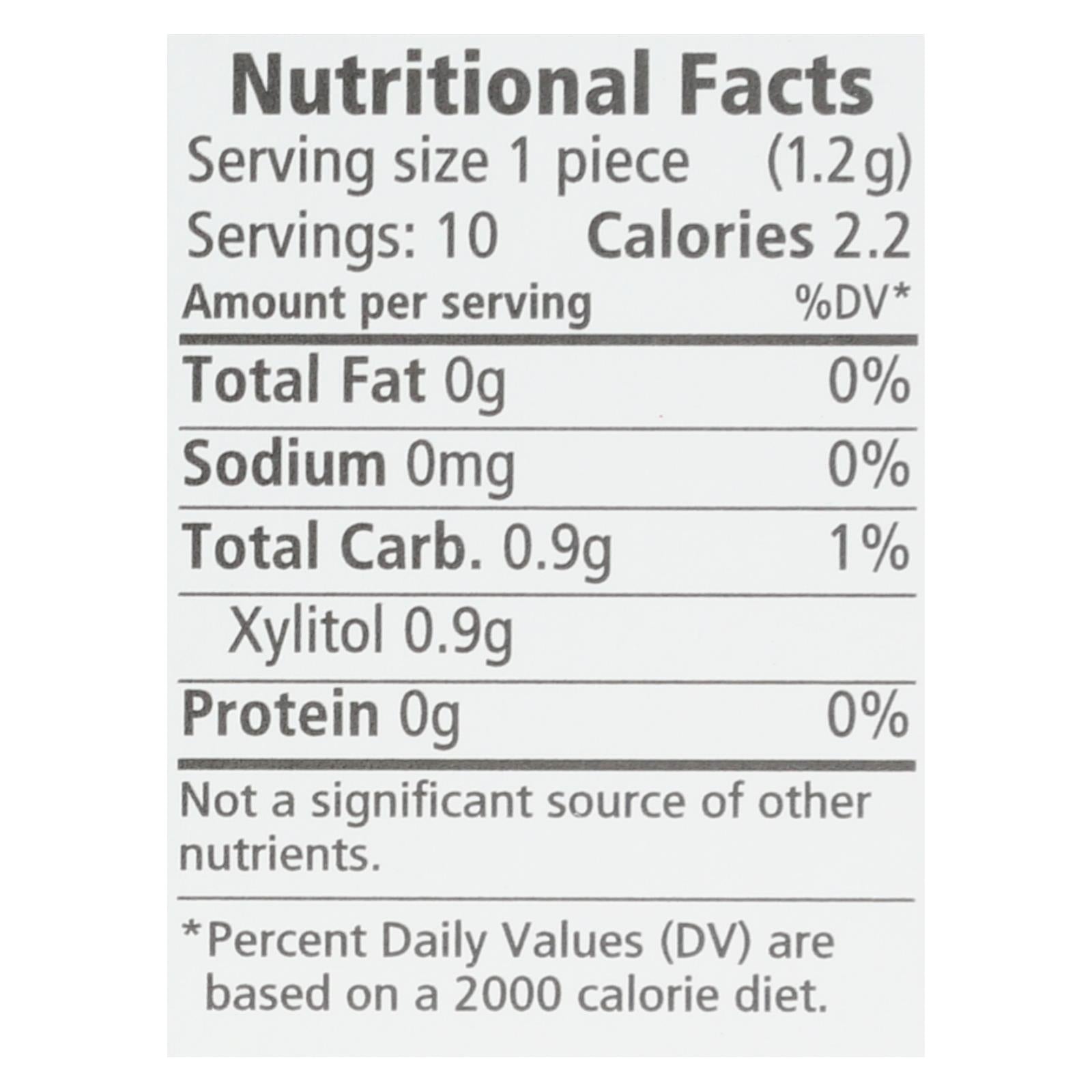Spry sugarfree spearmint chewing gum is made with xylitol, gum base, spearmint oil, gum arabic, calcium carbonate, vegetable glycerin, soy lecithin and carnauba wax. Each 10 piece sleeve contains 10 servings of one piece of chewing gum. Each serving contains 1.7 calories. Our chewing gum is vegan and gluten-free.