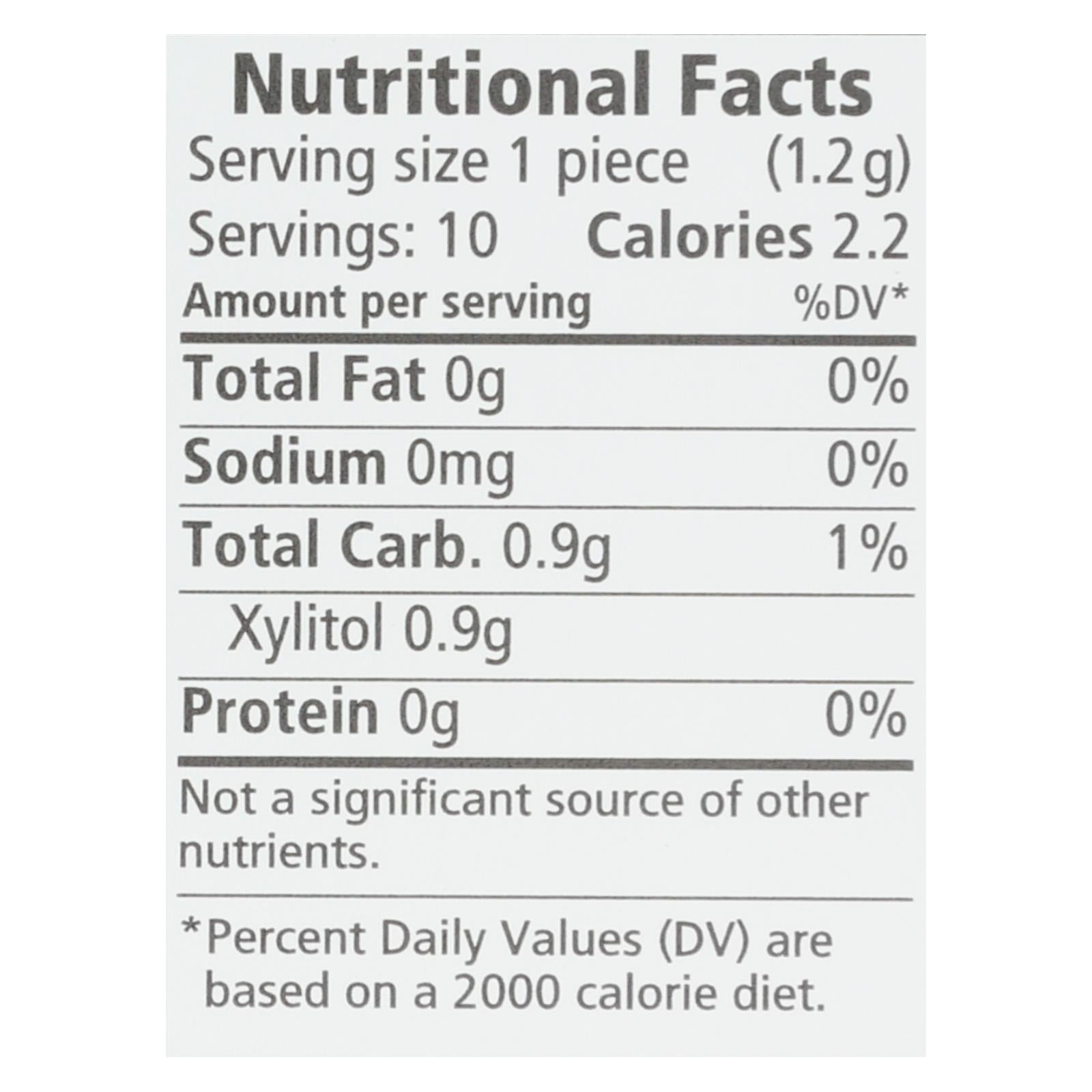 ingredients : xylitol;gum base;natural fruit flavors;malic acid;calcium carbonate;gum arabic;vegetable glycerin;sunflower lecithin;carnauba wax
