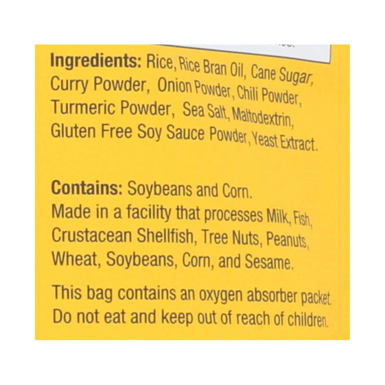 ingredients : rice;rice bran oil;cane sugar;curry powder;onion powder;chili powder;turmeric powder;sea salt;maltodextrin;gluten free soy sauce powder;yeast extract