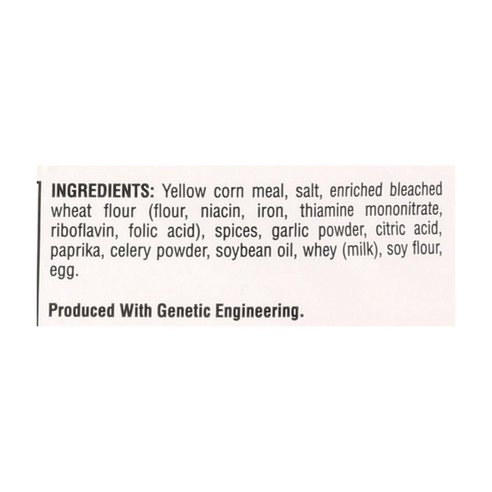 ingredients : yellow corn meal;salt;enriched bleached wheat flour;flour;niacin;iron;thiamine mononitrate;riboflavin;folic acid;spices;garlic powder;citric acid;paprika;celery powder;soybean oil;whey;milk;soy flour;egg