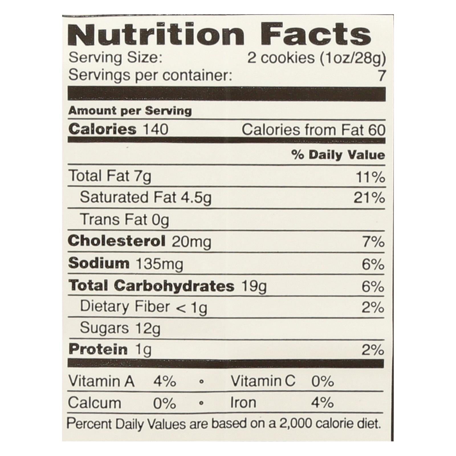 Tate's bake shop gluten free chocolate chip cookies are thin, buttery and crisp cookies made from simple ingredients like semi-sweet chocolate chips, rice flour, butter, cane sugar and eggs. Each 7 oz. Bagged container has 7 two craft-baked cookie servings. Each serving is 140 calories and 0 g. Of trans fat. See nutrition facts panel for allergens.