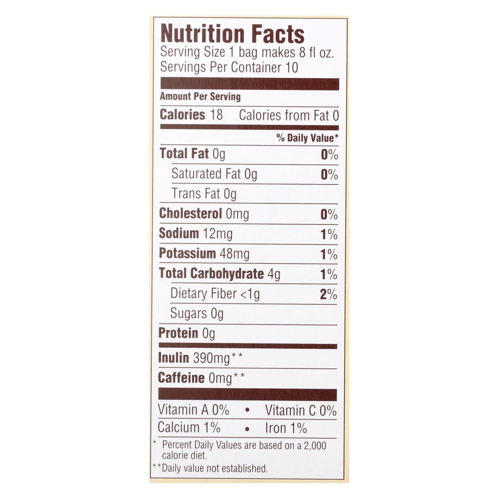 Teeccino chicory french roast herbal tea is certified qai organic and kosher-parve. Teeccino chicory french roast herbal tea features organic carob, barley, chicory, ramón seeds and natural coffee flavor. Every 10-count box contains naturally caffeine-free tea. See nutrition facts panel for allergens.