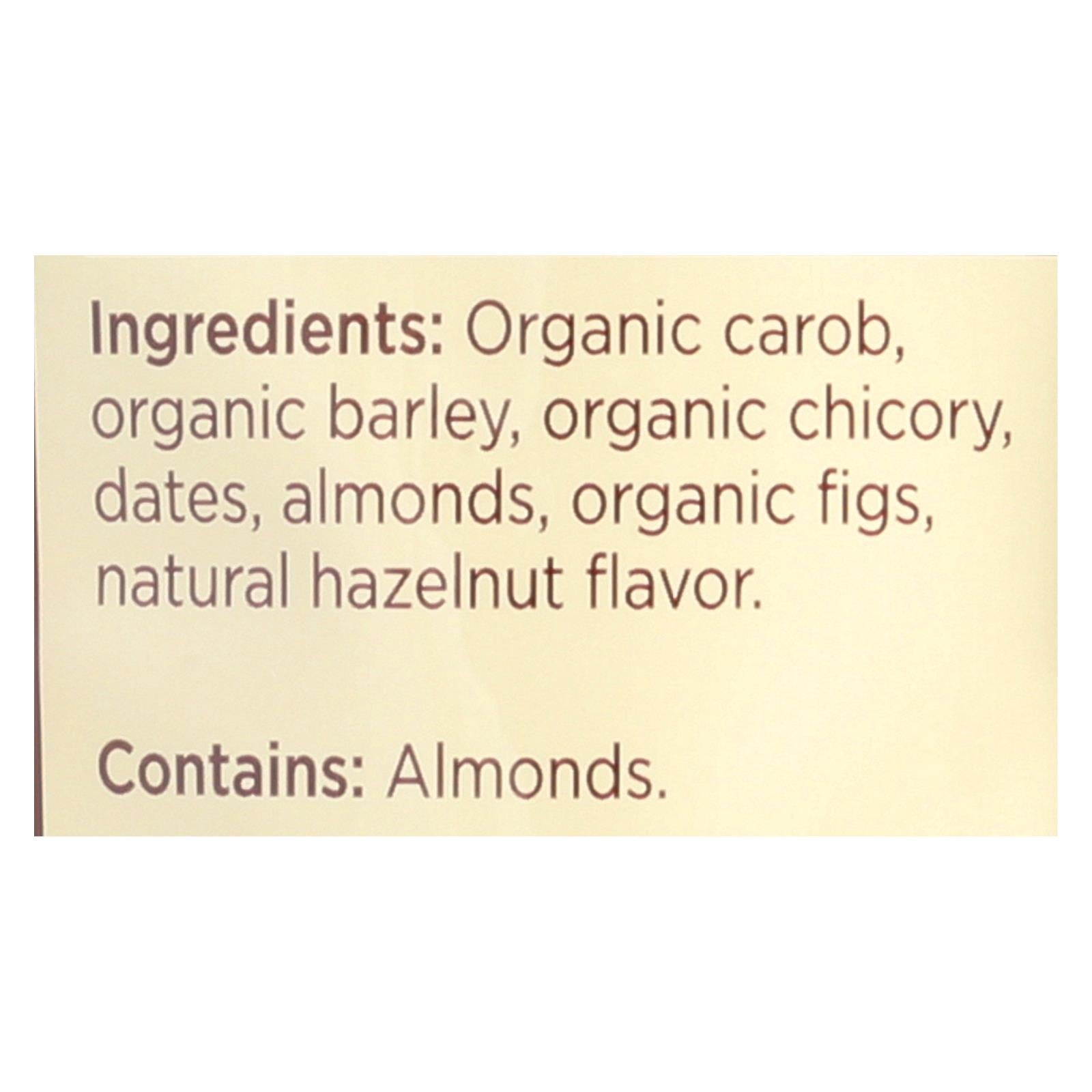 ingredients : organic carob;organic barley;organic chicory;dates;almonds;organic figs;natural hazelnut flavor