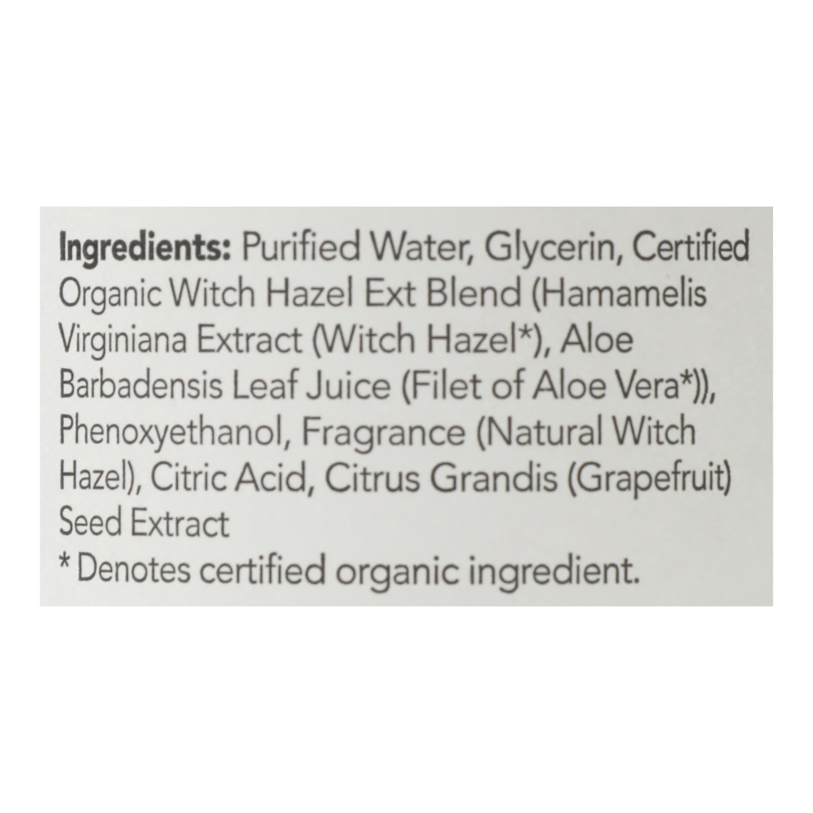 ingredients : purified water;glycerin;certified organic witch hazel ext blend (hamamelis virginiana extract (witch hazel*), aloe barbadensis leaf juice (filet of aloe vera*));phenoxyethanol;fragrance (natural witch hazel);citric acid;citrus grandis (grapefruit) seed extract