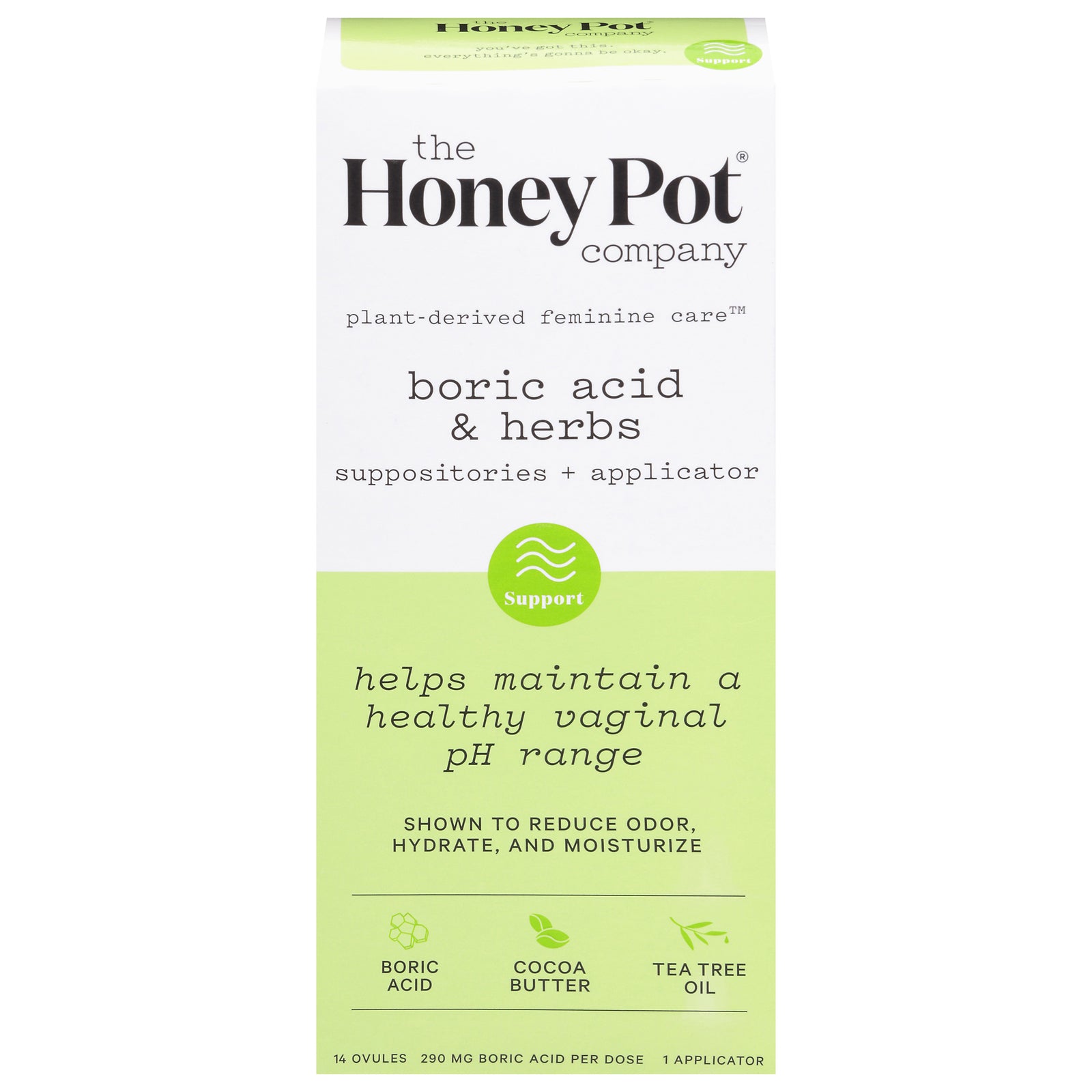 14 ovules. Soothe. Boric acid: antifungal. Cocoa butter: moisturizing. Tea tree oil: antibacterial. Plant-based feminine care. You've got this. Everything's gonna be okay. Made by humans with vaginas for humans with vaginas because it takes one to know one. I was suffering with bacterial vaginosis for 8 months when an ancestor came to me in a dream and gifted me with a vision to heal myself. With her help i created the honey pot co to solve for what other brands wouldn't, through the power of herbs. Thehoneypot.co. Some discharge over the course of the night is normal. For added comfort and protection, wear a honey pot herbal pantiliner. Avoid sexual intercourse while using suppository. (these statements have not been evaluated by the food and drug administration. This product is not intended to diagnose, treat, cure, or prevent any disease. The information provided does not constitute medical advice and should not take the place of consulting a physician. This information does not and should not replace treatment from a medical professional. If you need medical advice or assistance, you should consult a physician.) made in italy.