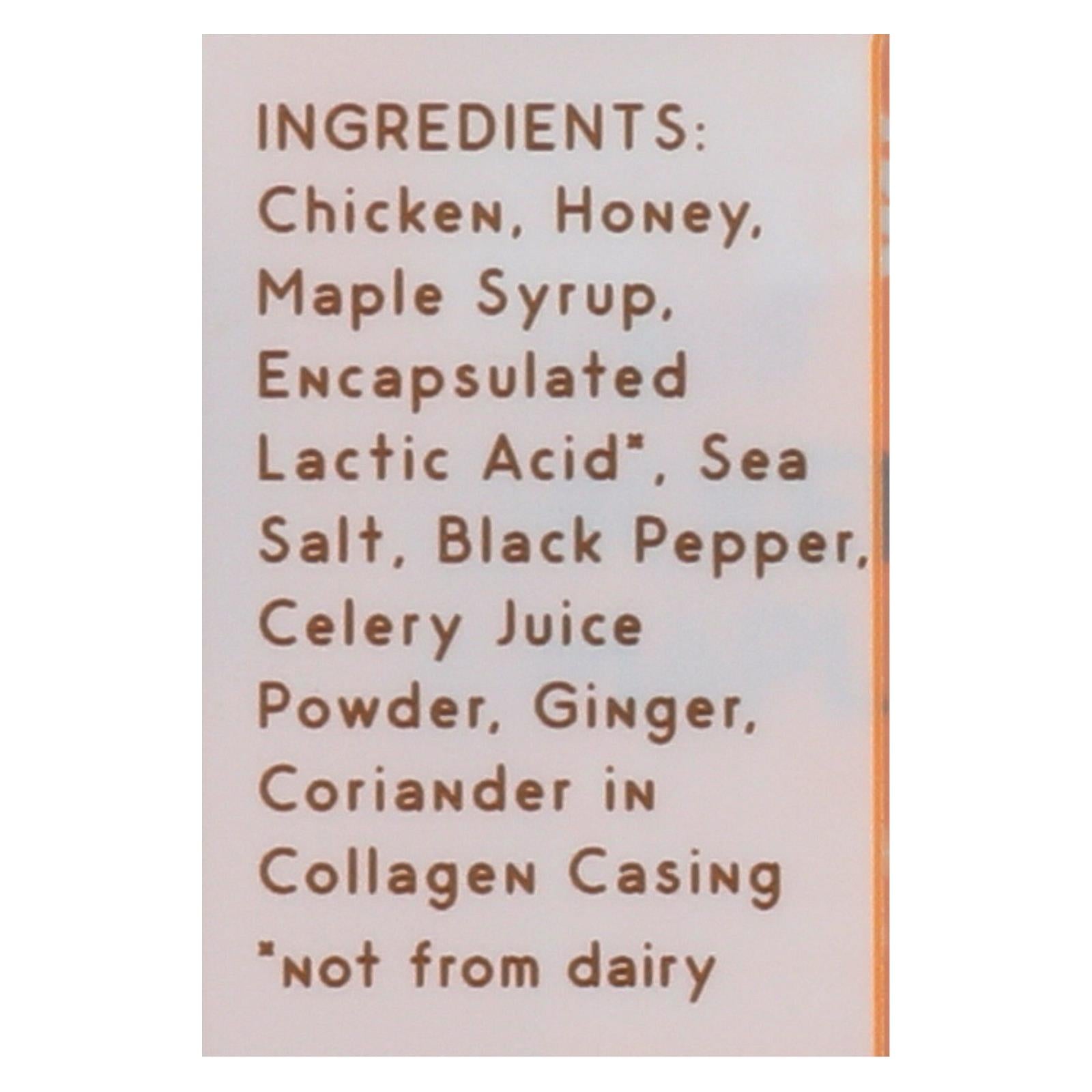 ingredients : all-natural* chicken raised without antibiotics;honey;sea salt;maple syrup;encapsulated citric acid;cultured celery juice powder (celery powder, sea salt);black pepper;ginger;coriander;in beef collagen casing
