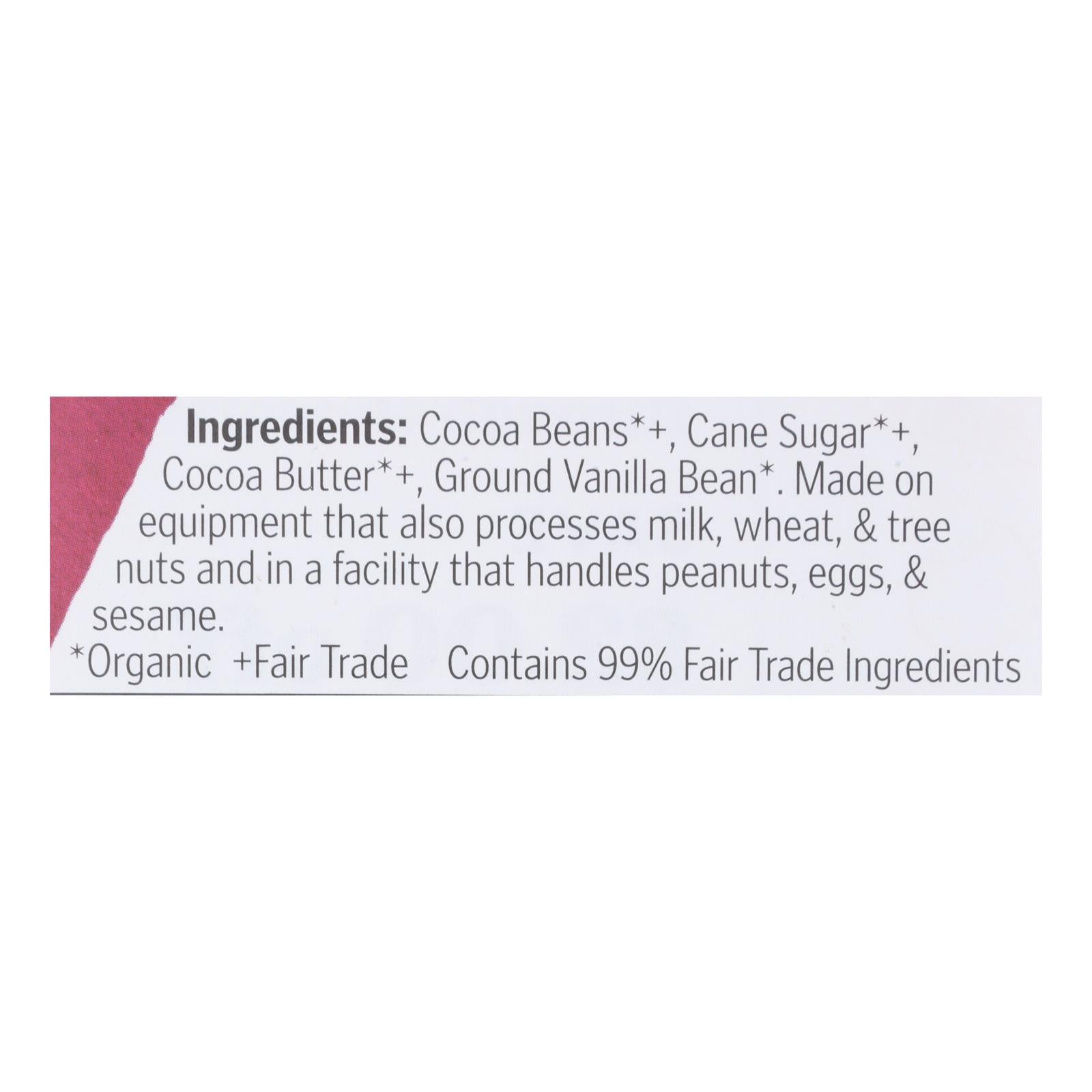 ingredients : cocoa beans*+;cane sugar*+;cocoa butter*+;ground vanilla bean