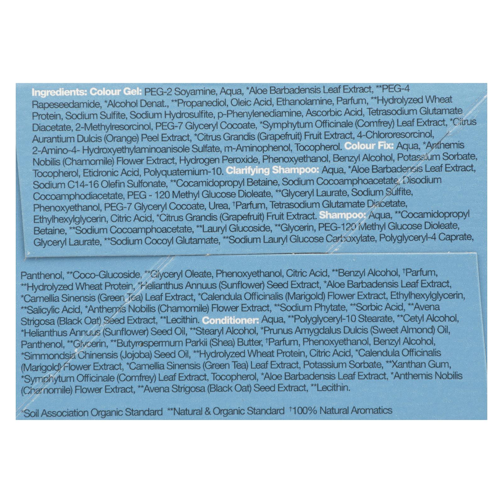 ingredients : colour gel: peg-2 soyamine;aqua;aloe barbadensis leaf extract;peg-4 rapeseedamide;alcohol denat;propanediol;oleic acid;ethanolamine;parfum;hydrolyzed wheat protein;sodium sulfite;sodium hydrosulfite;p-phenylenediamine;ascorbic acid;tetrasodium glutamate diacetate;2-methylresorcinol;peg-7 glyceryl cocoate;symphytum officinale;comfrey;leaf extract;citrus aurantium dulcis;orange;peel extract;citrus grandis;grapefruit;fruit extract;4-chlororesorcinol;2-amino-4- hydroxyethylaminoanisole sulfate;m-ami