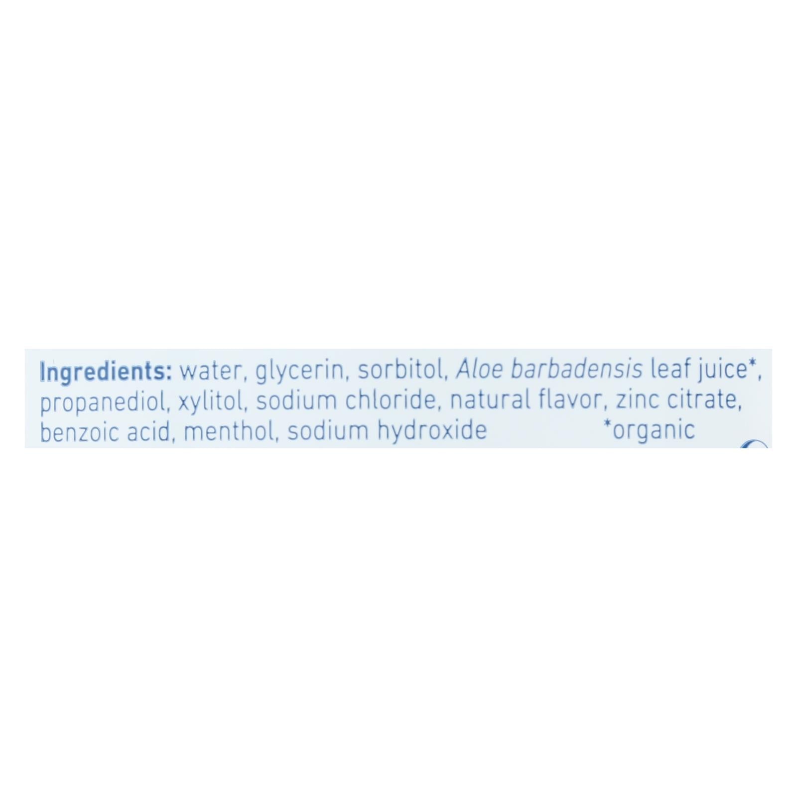 ingredients : water;glycerin;sorbitol;aloe barbadensis leaf juice;propanediol;xylitol;sodium chloride;natural flavor;zinc citrate;benzoic acid;menthol;sodium hydroxide