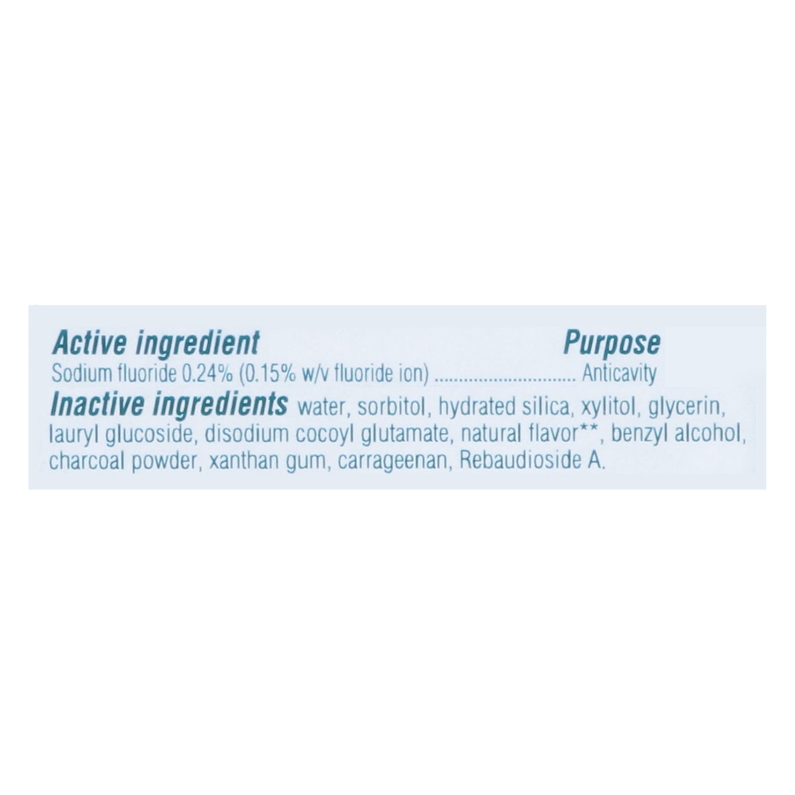 ingredients : sodium fluoride 0;24% (0.15% w/v fluoride ion) purpose anticavity;water;sorbitol;hydrated silica;xylitol;glycerin;lauryl glucoside;disodium cocoyl glutamate;natural flavor;benzyl alcohol;charcoal powder;xanthan gum;carrageenan;rebaudiosidea