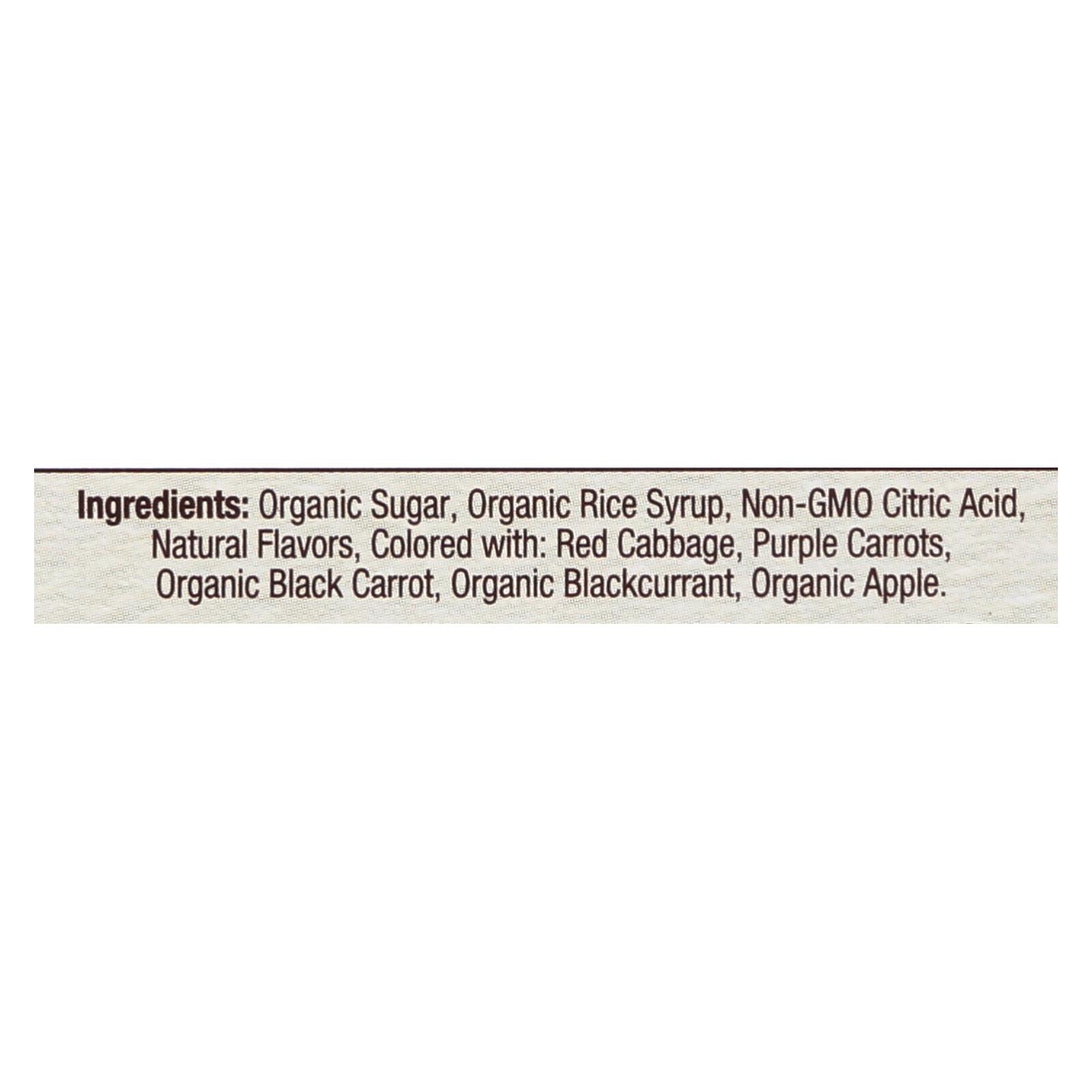 ingredients : organic sugar;organic rice syrup;non-gmo citric acid;natural flavors;colored with: red cabbage, purple carrots, organic black carrot, organic blackcurrant, organic apple