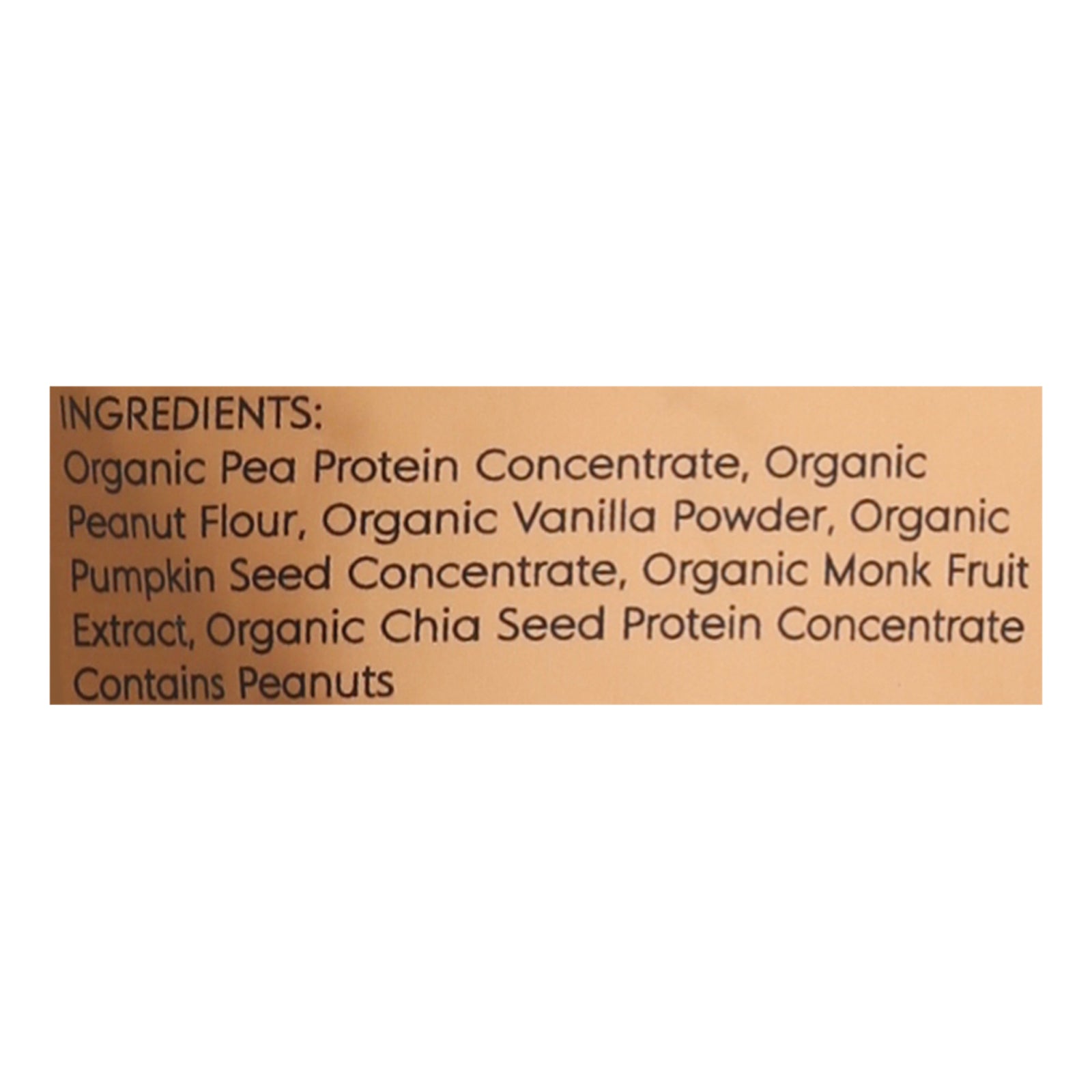 ingredients : organic pea protein concentrate;organic peanut flour;organic vanilla powder;organic pumpkin seed concentrate;organic monk fruit extract;organic chia seed protein concentrate