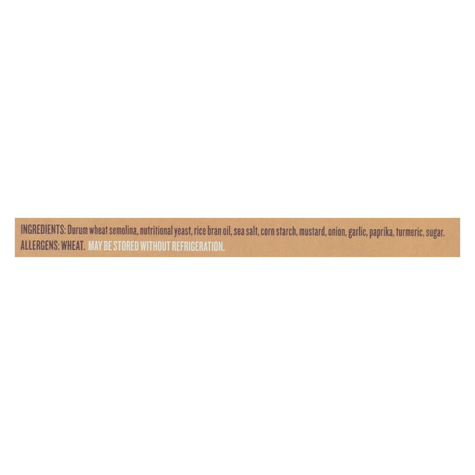 ingredients : durum wheat semolina;nutritional yeast;rice bran oil;sea salt;corn starch;mustard;onion;garlic;paprika;turmeric;sugar