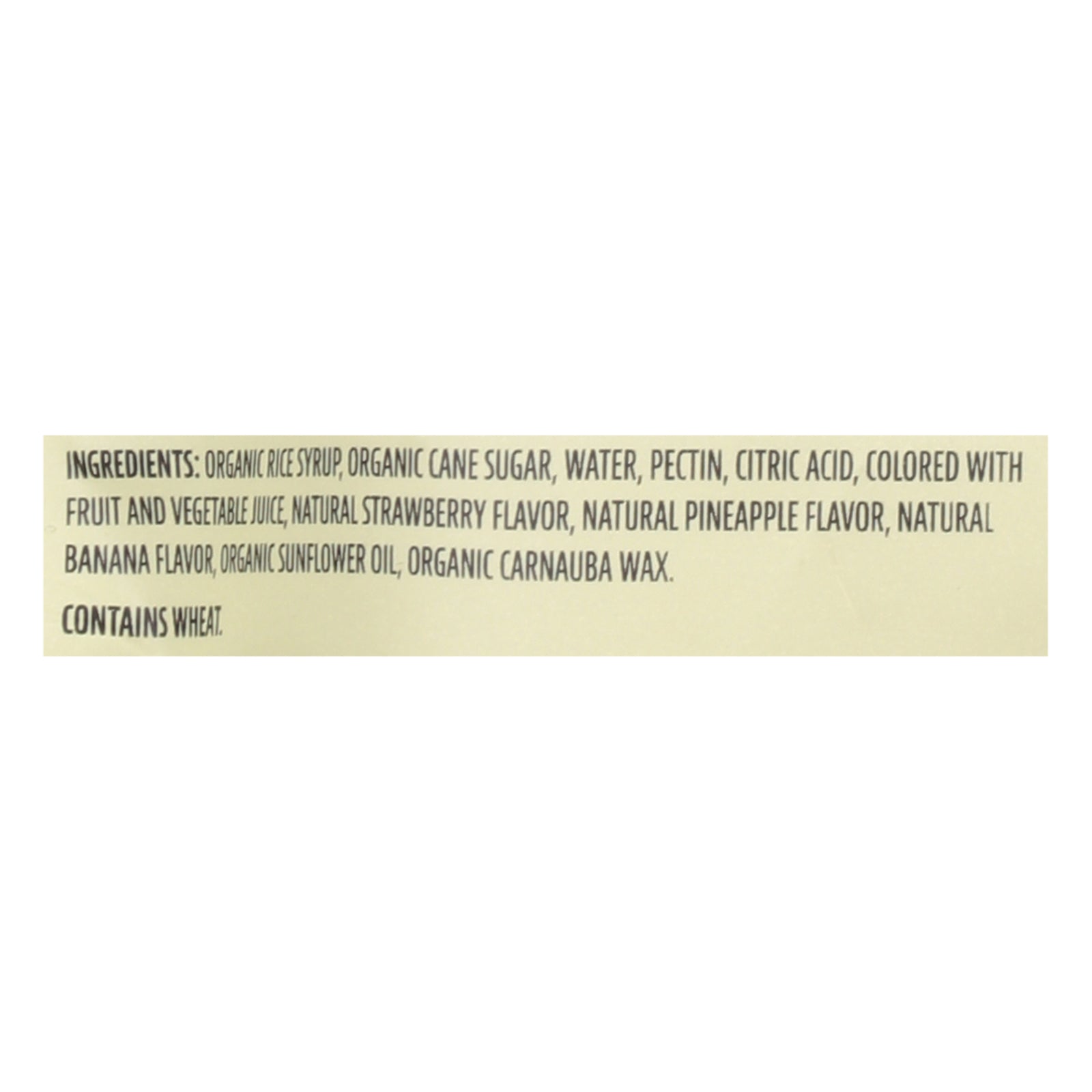 ingredients : organic rice syrup;organic cane sugar;water;pectin;citric acid;colored with fruit and vegetable juice;natural strawberry flavor;natural pineapple flavor;natural banana flavor;organic sunflower oil;organic carnauba wax