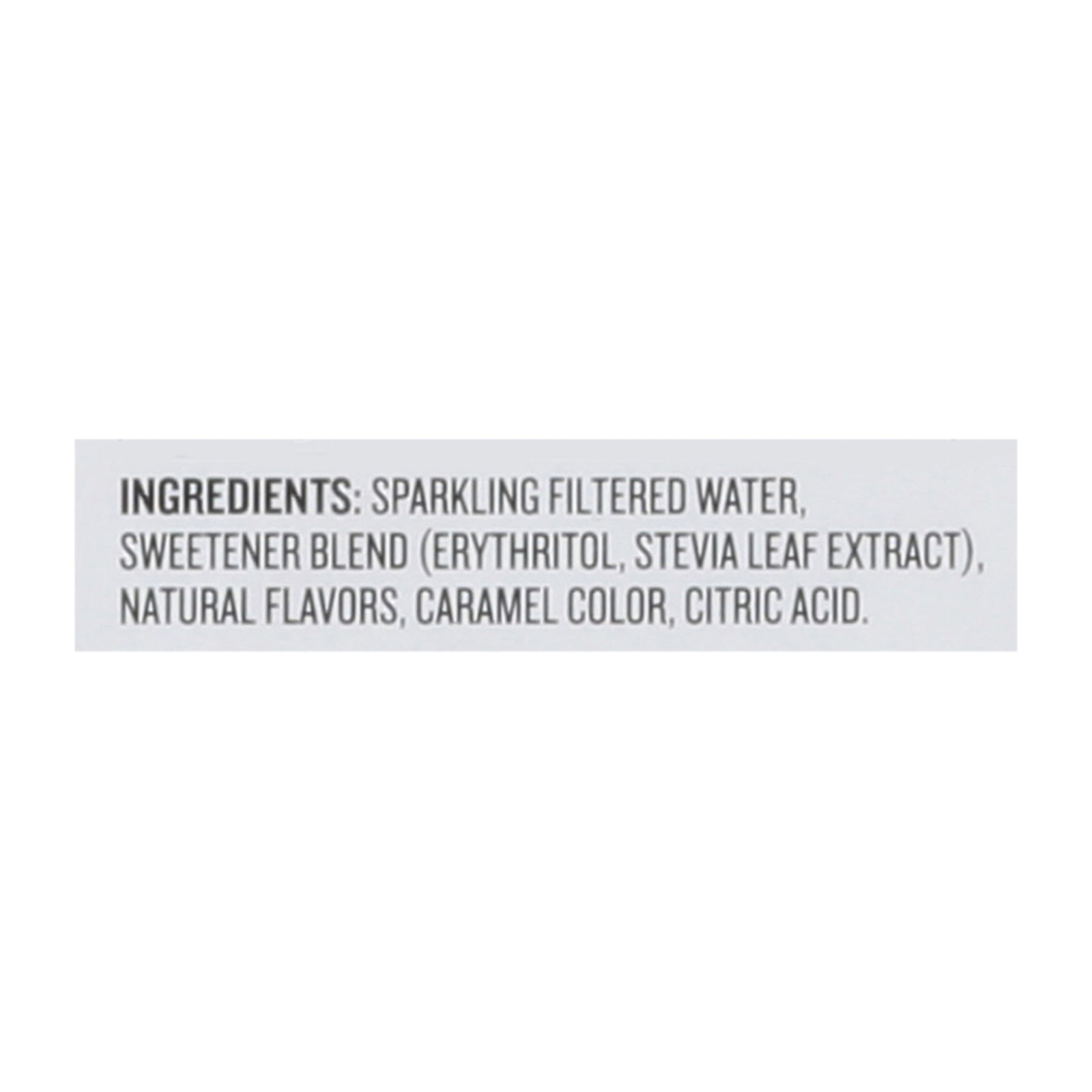 ingredients : sparkling filtered water;sweetener blend (erythritol, stevia leaf extract);natural flavors;caramel color;citric acid