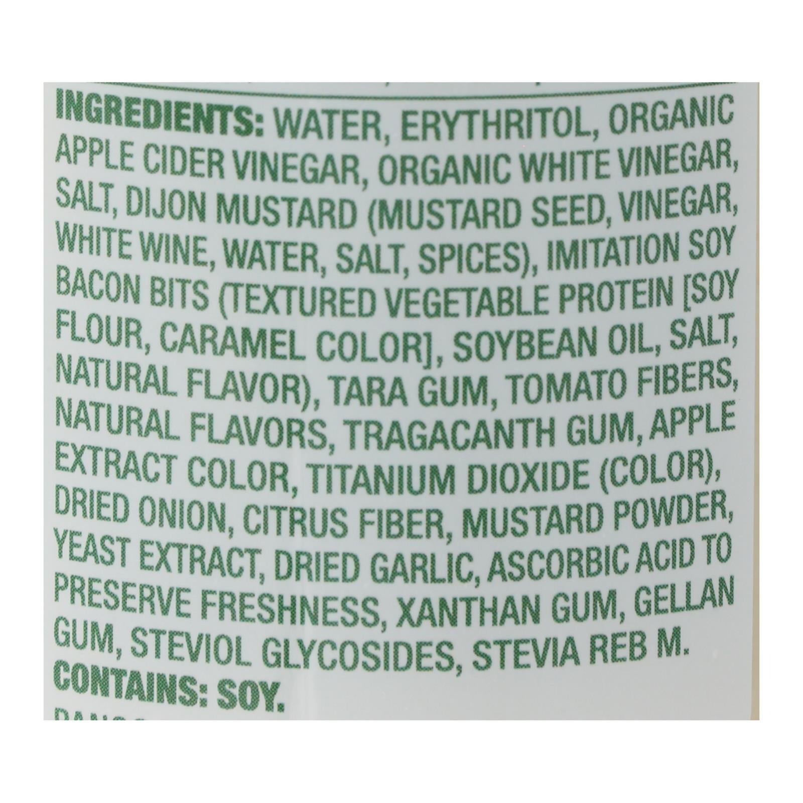 ingredients : water;erythritol;organic apple cider vinegar;organic white vinegar;salt;dijon mustard (mustard seed, vinegar, white wine, water, salt, spices);imitation soy bacon bits (textured vegetable protein [soy flour, caramel color], soybean oil, salt, natural flavor);tara gum;tomato fibers;natural flavors;tragacanth gum;apple extract color;titanium dioxide (color);dried onion;citrus fiber;mustard powder;yeast extract;dried garlic;ascorbic acid to preserve freshness;xanthan gum;gellan gum;steviol glycosid