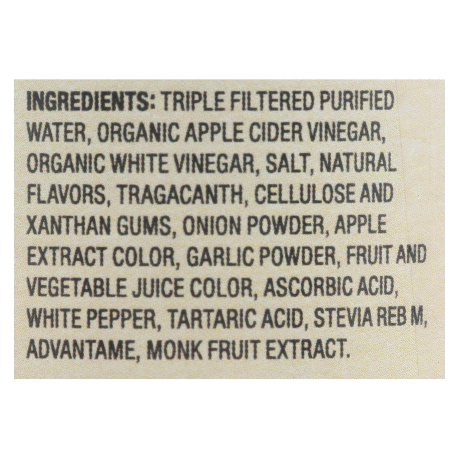 ingredients : triple filtered purified water;organic apple cider vinegar;organic white vinegar;salt;natural flavors;tragacanth;cellulose and xanthan gums;onion powder;apple extract color;garlic powder;fruit and vegetable juice color;ascorbic acid;white pepper;tartaric acid;stevia reb m;advantame;monk fruit extract