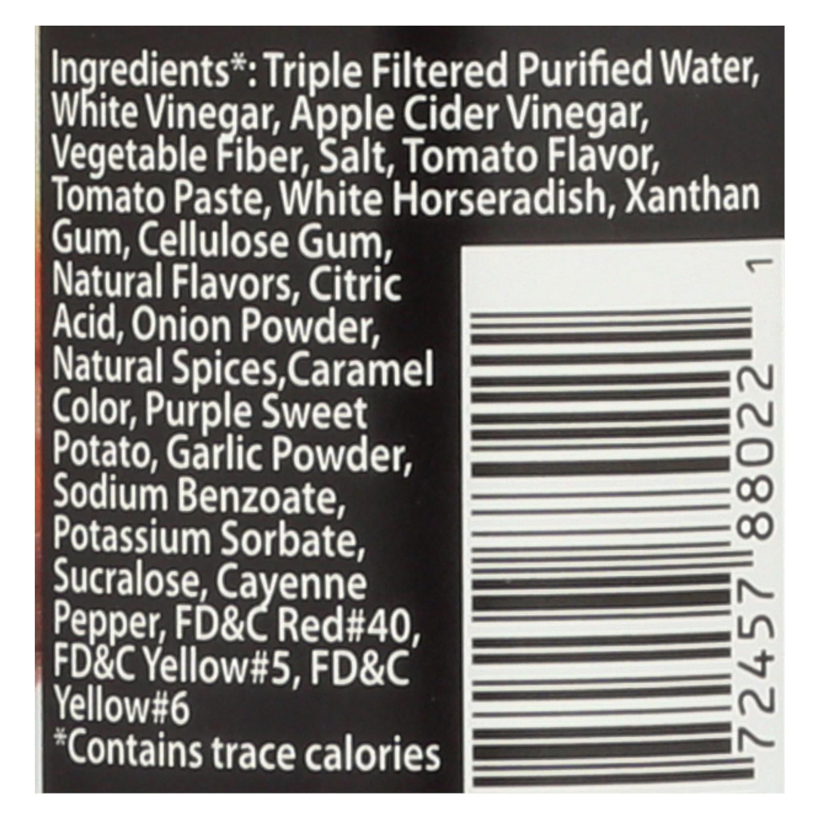 ingredients : triple filtered purified water;white vinegar;apple cider vinegar;vegetable fiber;salt;tomato flavor;tomato paste;white horseradish;xanthan gum;cellulose gum;natural flavors;citric acid;onion powder;natural spices;caramel color;purple sweet potato;garlic powder;sodium benzoate;potassium sorbate;sucralose;cayenne pepper;fd&c red #40;fd&c yellow#5;fd&c yellow#6