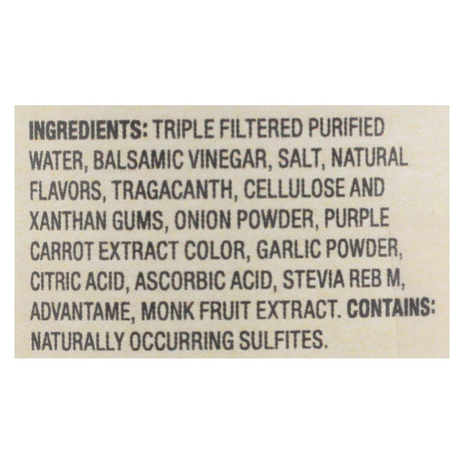 ingredients : water;balsamic vinegar (wine vinegar, concentrated grape must, caramel color) ;salt;apple cider vinegar;natural flavors;xanthan gum;propylene glycol alginate;monk fruit juice concentrate ;dried onion;fruit and vegetable juice for color ;sodium citrate;dried garlic;erythritol;steviol glycosides;citric acid;ascorbic acid to preserve freshness;gellan gum;stevia reb m
