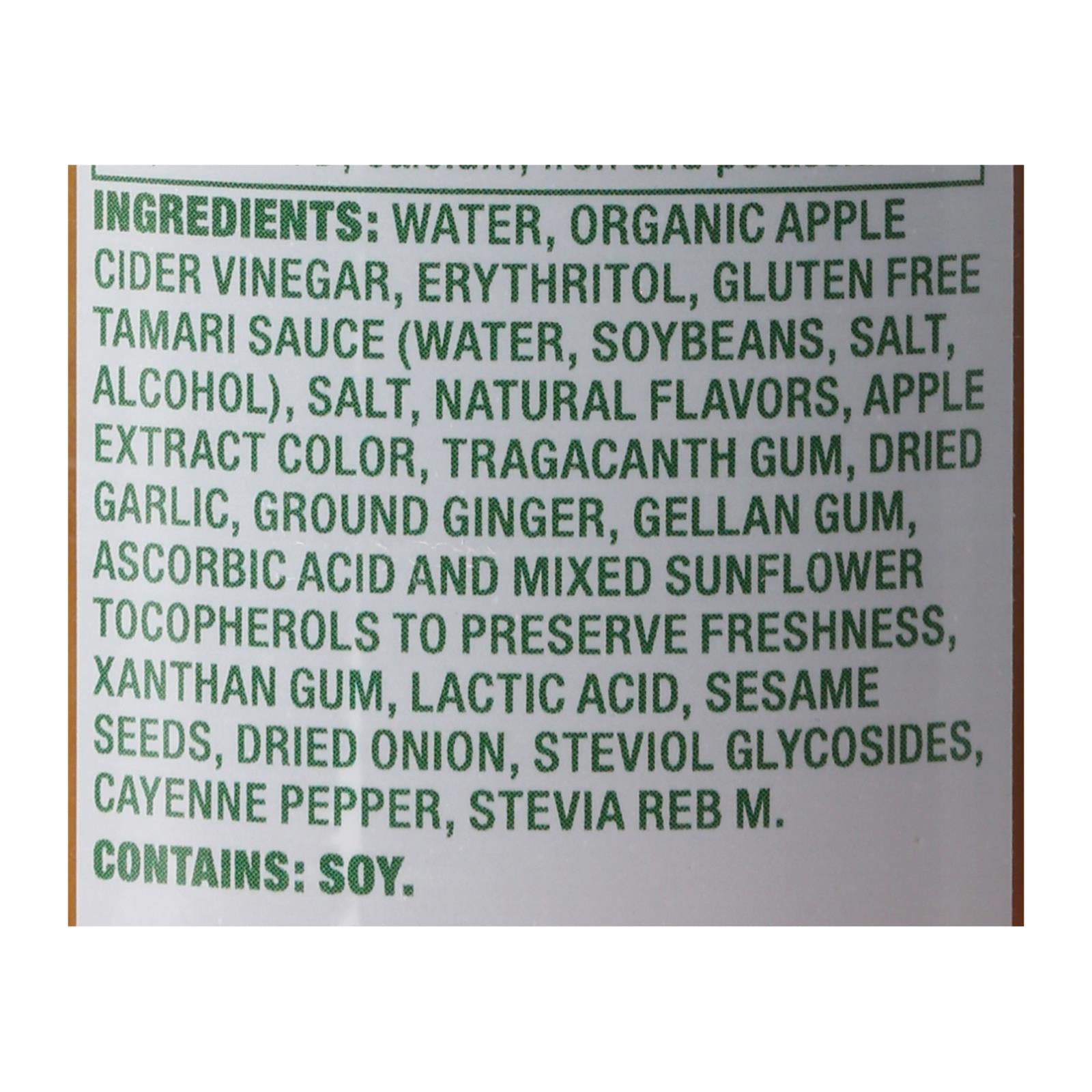 ingredients : water;organic apple cider vinegar;erythritol;gluten free tamari sauce (water, soybeans, salt, alcohol);salt;natural flavors;apple extract color;tragacanth gum;dried garlic;ground ginger;gellan gum;ascorbic acid and mixed sunflower tocopherols to preserve freshness;xanthan gum;lactic acid;sesame seeds;dried onion;steviol glycosides;cayenne pepper;stevia reb m