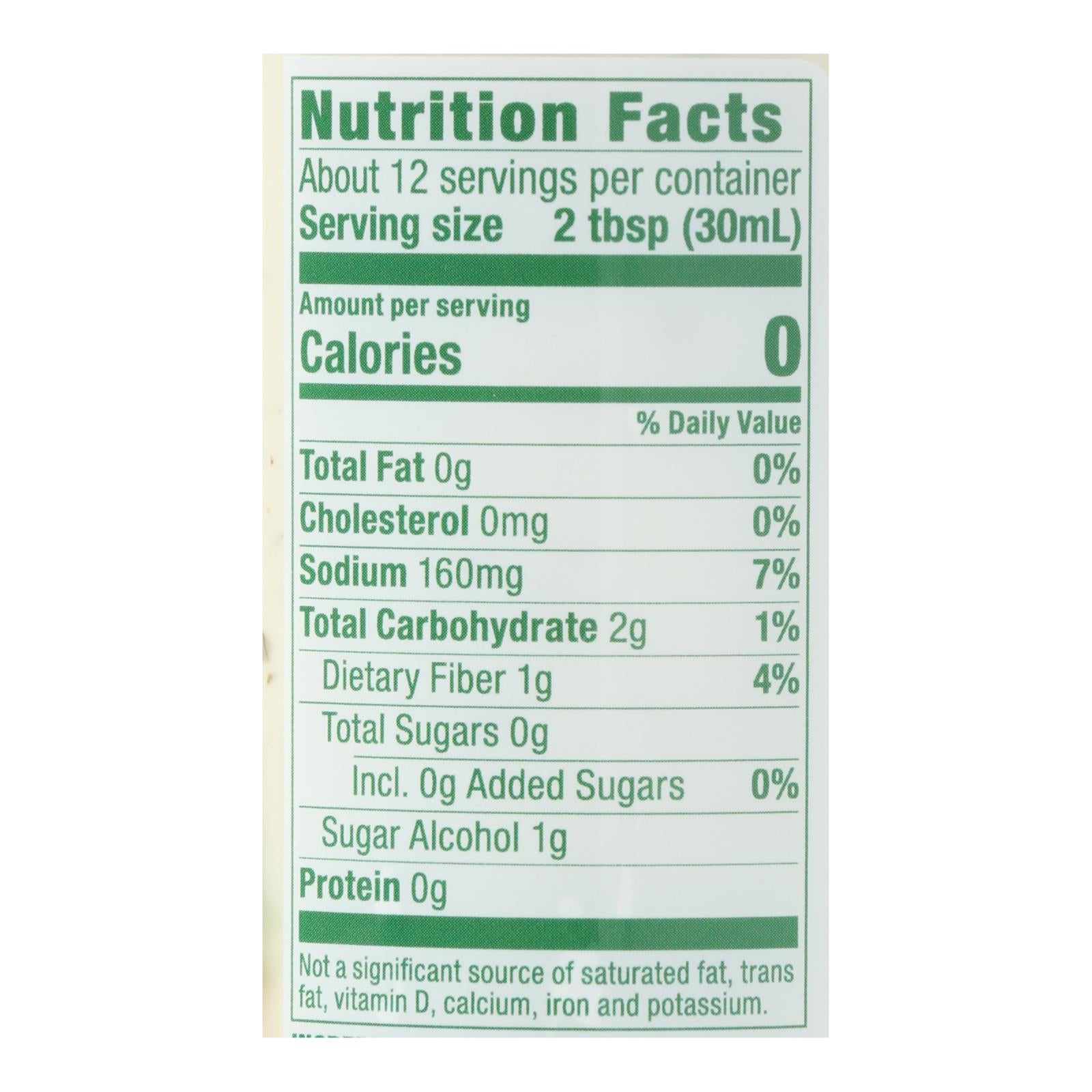 ingredients : water;white distilled vinegar;corn fiber;erythritol;salt;cellulose gel;titanium dioxide (color);xanthan gum;natural flavors;garlic puree;onion puree;propylene glycol alginate (algae extract);lemon juice concentrate ;sodium citrate;yeast extract;mustard flour;lactic acid;dried chives;black pepper;parsley;gellan gum;celery seed;dill