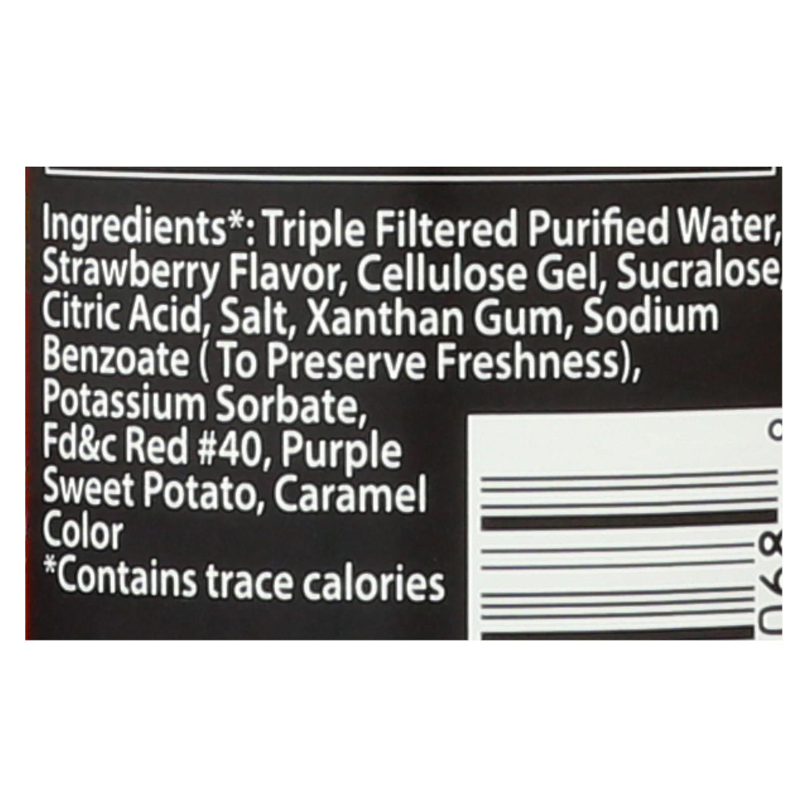 ingredients : triple filtered purified water;strawberry flavor;cellulose gel;sucralose;citric acid;salt;xanthan gum;sodium benzoate;to preserve freshness;potassium sorbate;fd&c red #40;purple sweet potato;caramel color