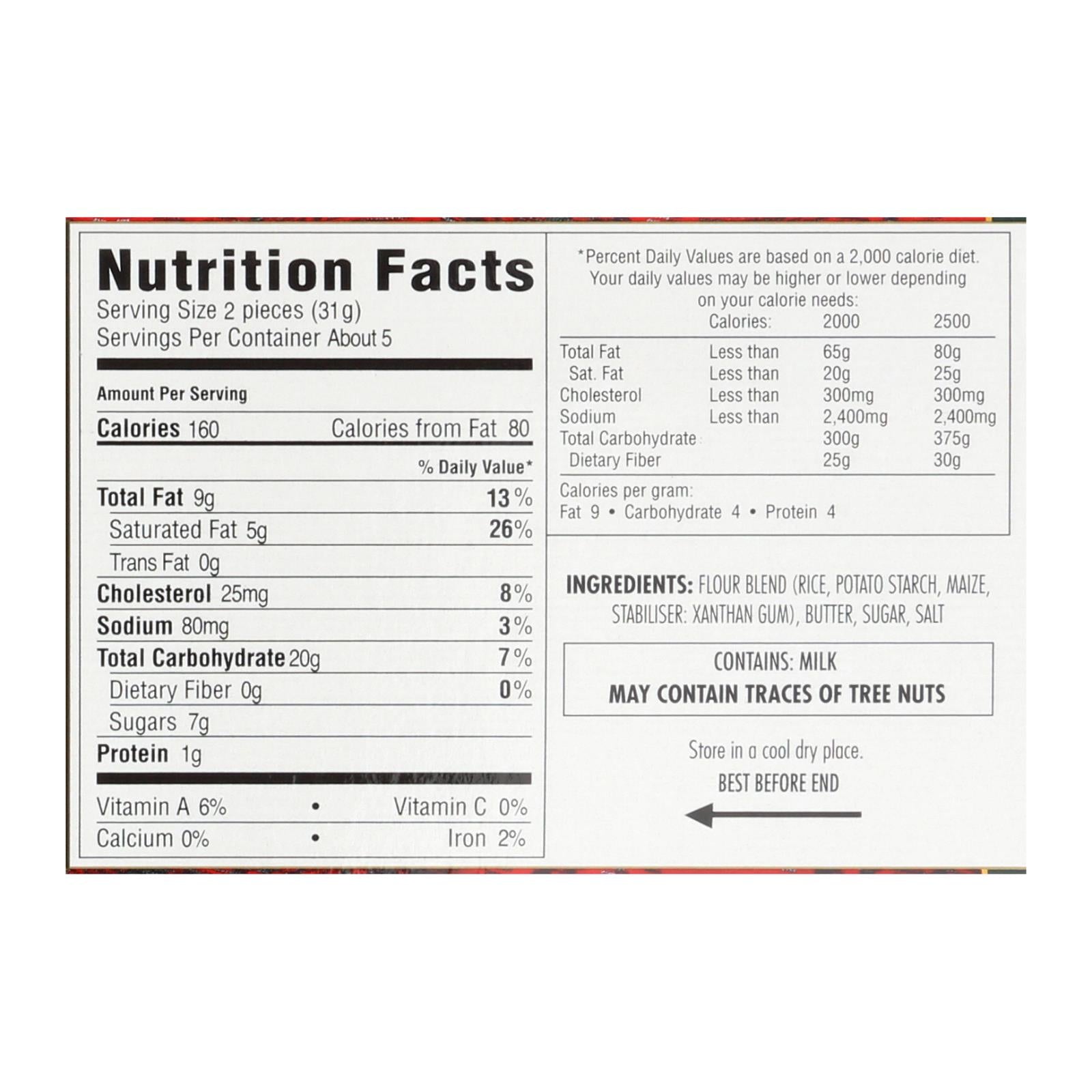 Walkers shortbread cookies are made using the finest ingredients possible. Every 4.9 g. Package of gluten free shortbread rounds is also free of gmos, trans fat, hydrogenated oils, artificial flavors, colors and preservatives. Our gluten free shortbread rounds are made from a flour blend containing rice, potato starch and maize. See nutrition facts panel for allergens.